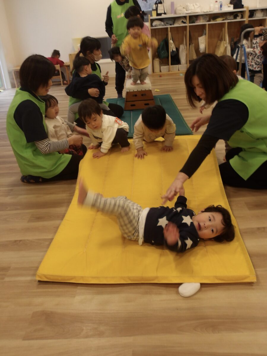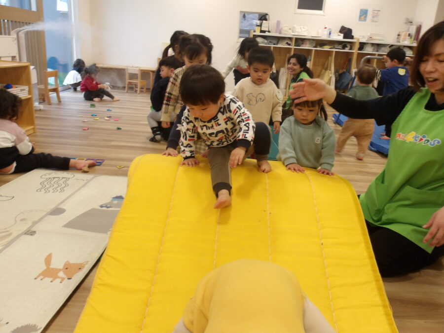 大きなお山のマット、登ってはお腹で滑って楽しいね![]()