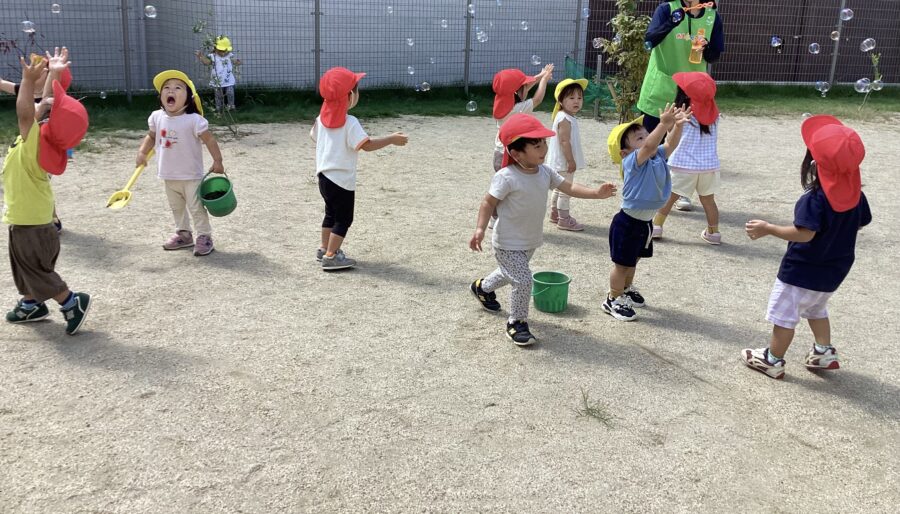 シャボン玉をするとふ〜っと吹きたいお友だちや、一生懸命掴もうと走るお友だちも![]()