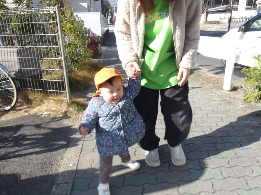 歩けるようになってきたら保育士と手を繋いで歩くのに挑戦します!