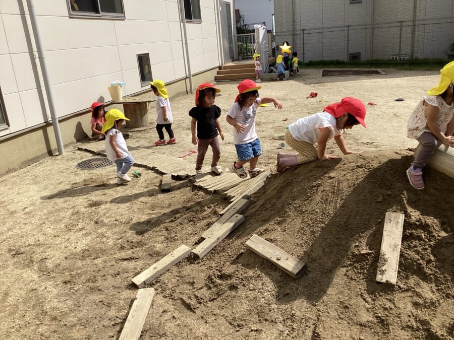 もう一つのお砂のお山には、皆で木の積み木を運んでお砂のお山が登りやすいように何やらお友達同士で作って、たくさんハシゴができていましたよ![]()