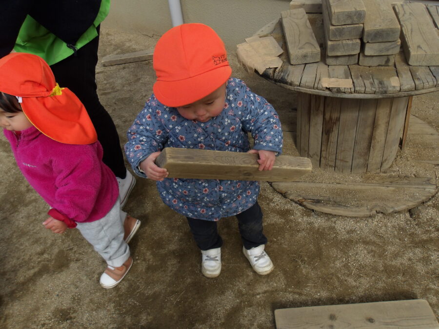 “よいしょよいしょ♪”大きな木の板を運ぶお手伝い