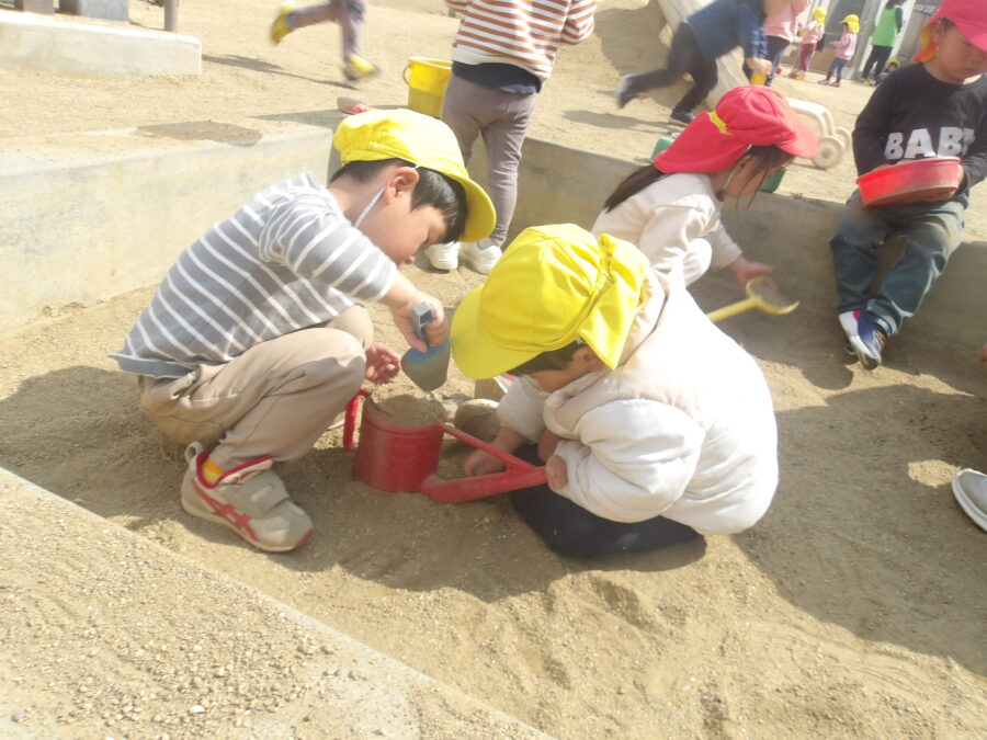お砂場では、たくさんのお友達が集まり、お砂でお友達とともに色々なものを作って楽しんでいましたよ![]()