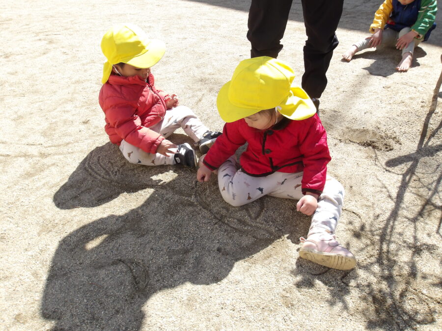 お友達や保育士と地面にお絵描きをしている様子も見られました![]()