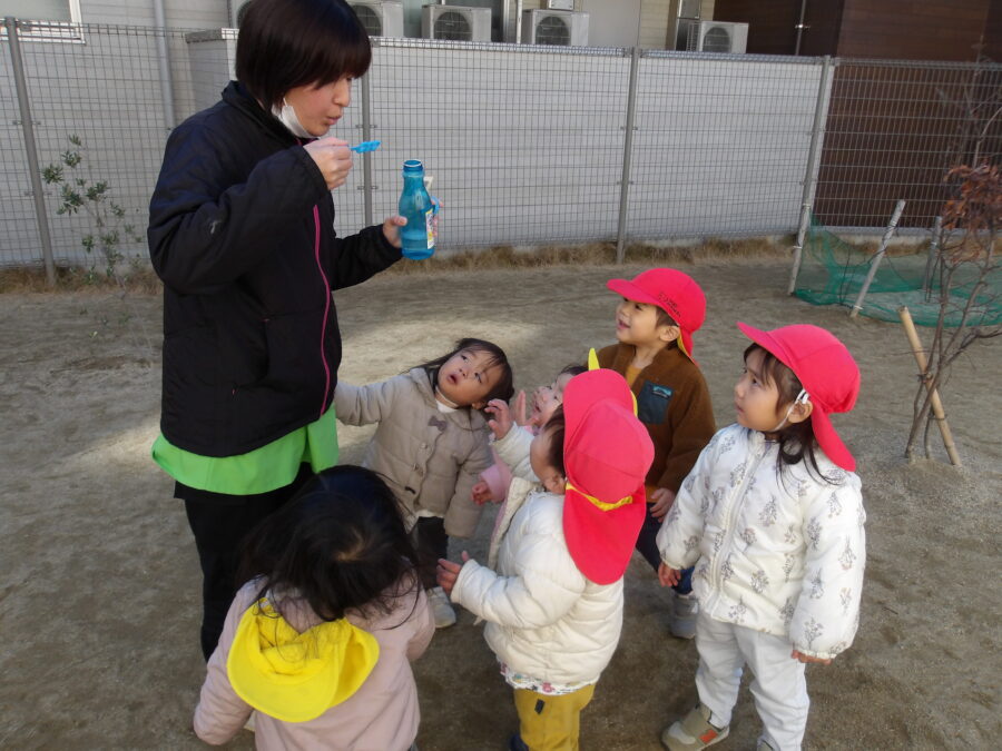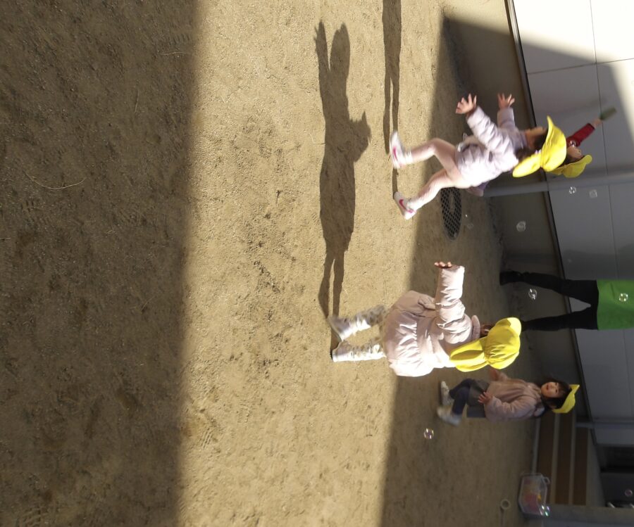 どんなお家ができるかな シャボン玉楽しいね たくさんのシャボン玉嬉しいね 好きなところに行き楽しく遊んでいます