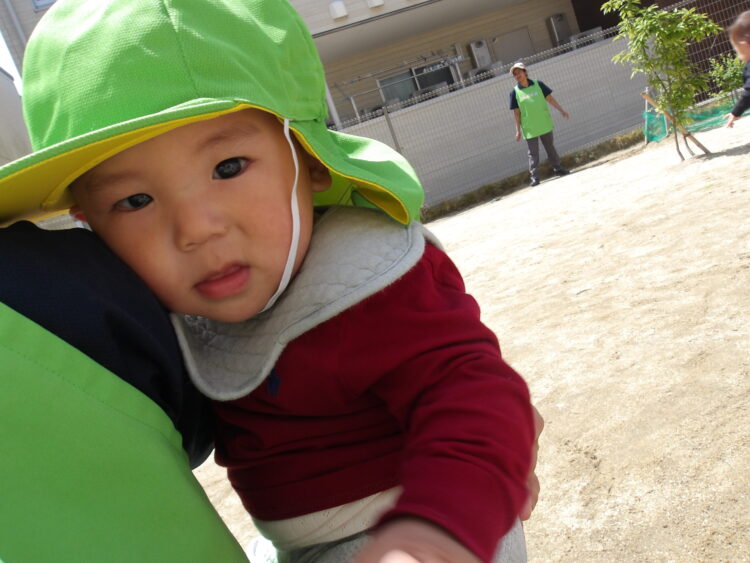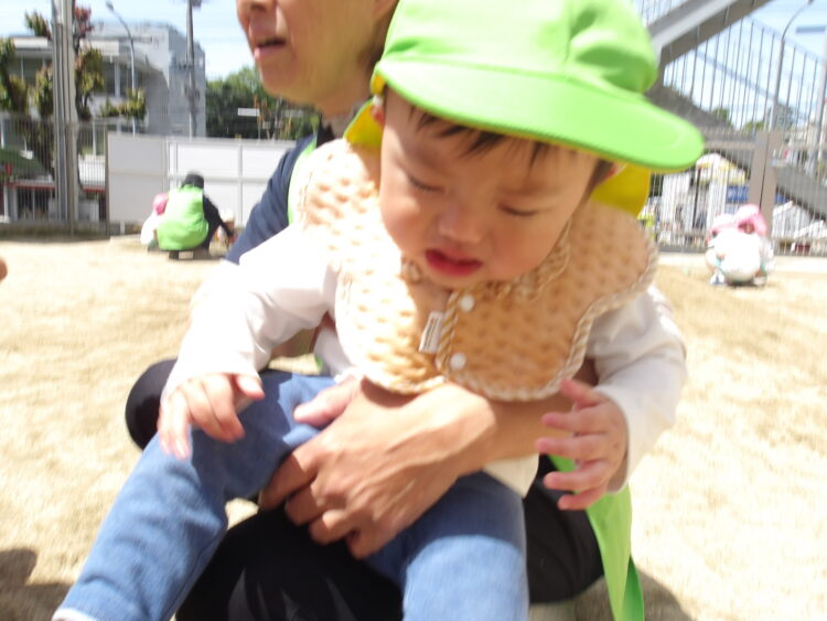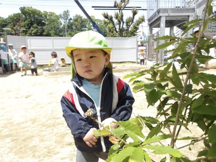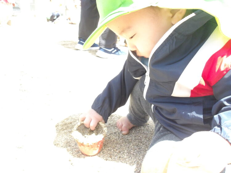 ひよこ組さんは葉っぱを触ったり、カップにお砂を入れて遊んで楽しんでいました![]()