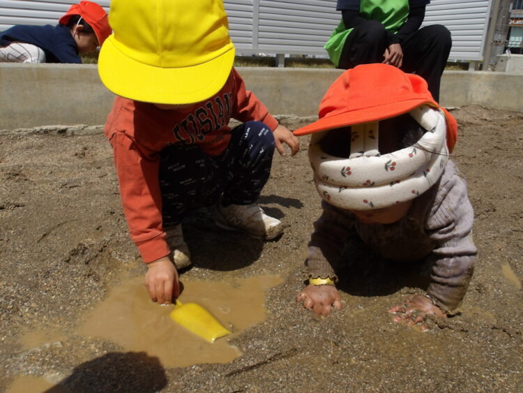 お砂場にもお水が溜まっていて触って感触を楽しんでいる子もいました!!