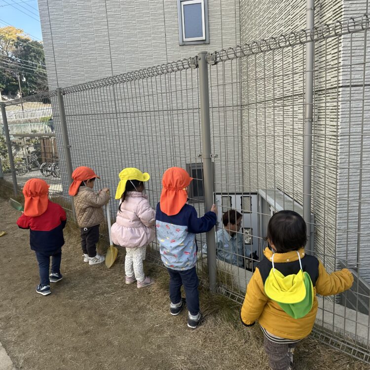 隣のマンションで電気ケーブルのメンテナンス。何してるのー?と声を掛けて様子をジーッと見ています。
