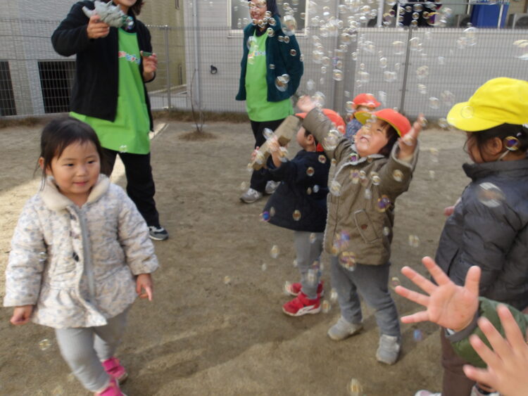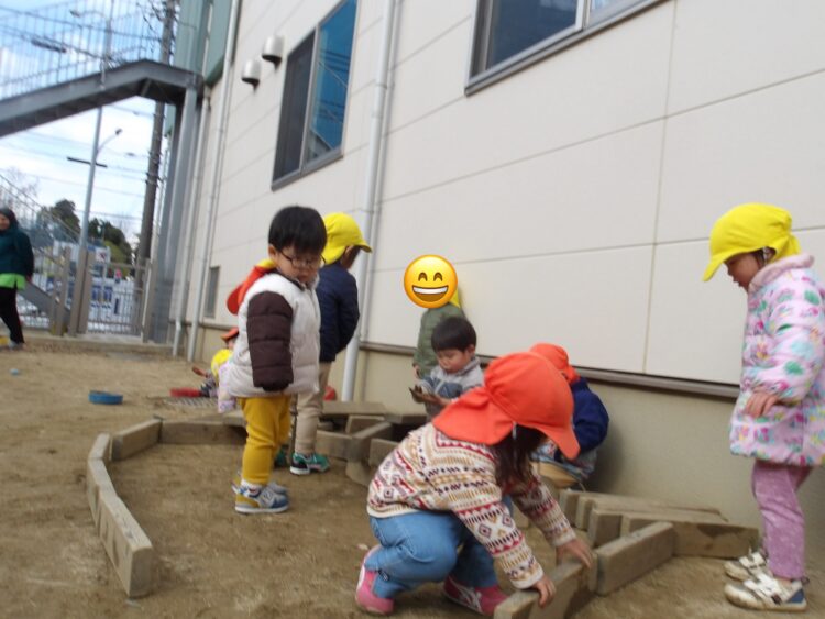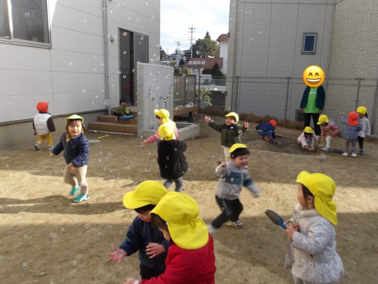 まずは大好きなシャボン玉!🫧🫧みんな大はしゃぎで追っかけていました🫧🫧🫧  枕木を使ってお家建設中! シャベルで砂をすくって泥団子作りもしています! お山に登って、駆け降りる遊びも今ブームです! 救急車のサイレンが聞こえるとみんな道路の方に集まってきますよ🚑今日もたくさん遊べました😆