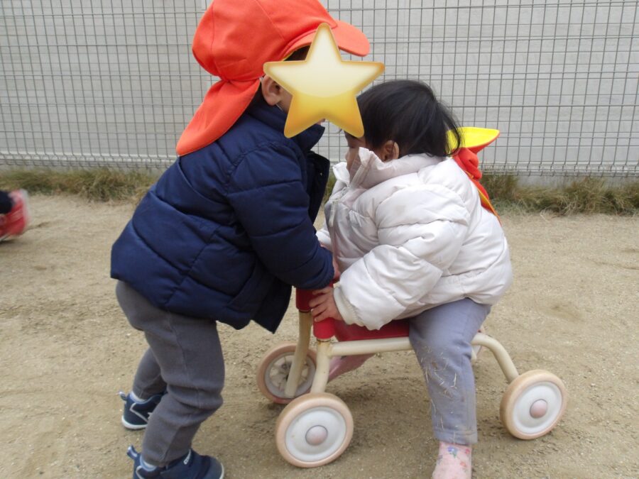 お友だちが乗っていると、押してくれて、とっても優しいですね![]()