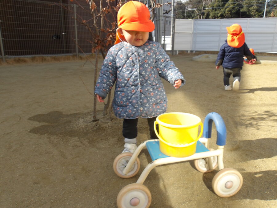 今日は園庭で遊びました手押し車は大人気座るところに、バケツを乗せてお出かけしていましたよ 周りに気をつけて、すごいスピードで走っていましたよ!「まてまてー」と追いかけると、ニコニコで逃げていましたよ 水が流れてるのが気になってのぞいていましたよ園庭でも自分の好きな遊びを見つけて遊べるようになってきました