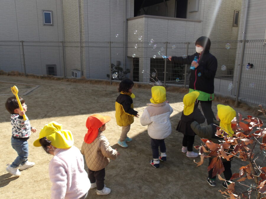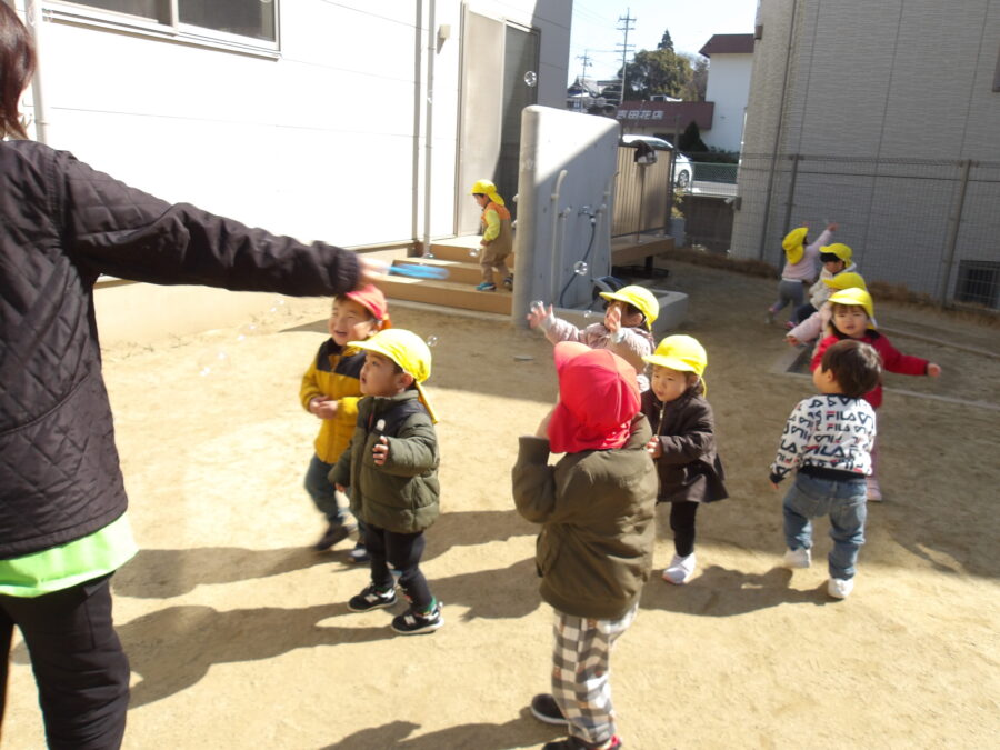 シャボン玉を始めると、みんな、「きゃー」と言ってニコニコ😊で嬉しそうですよ