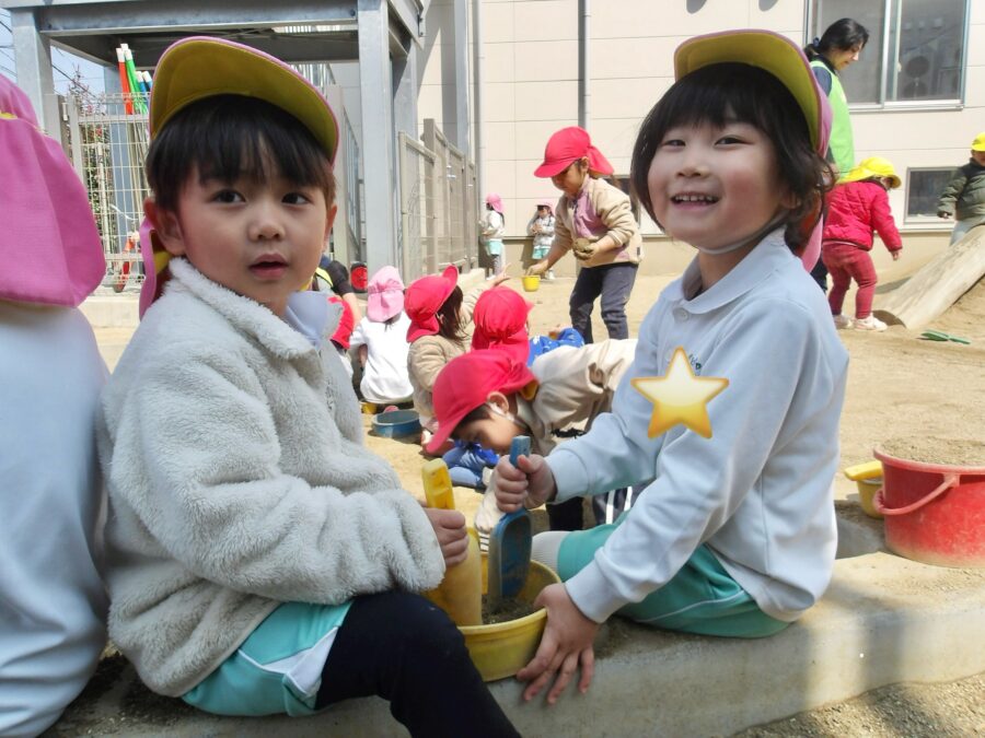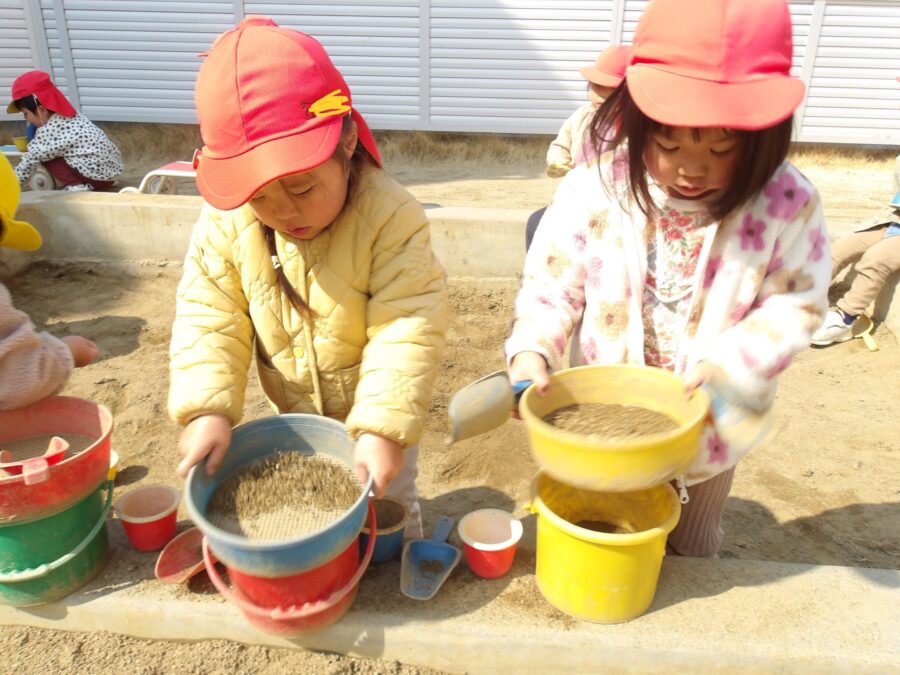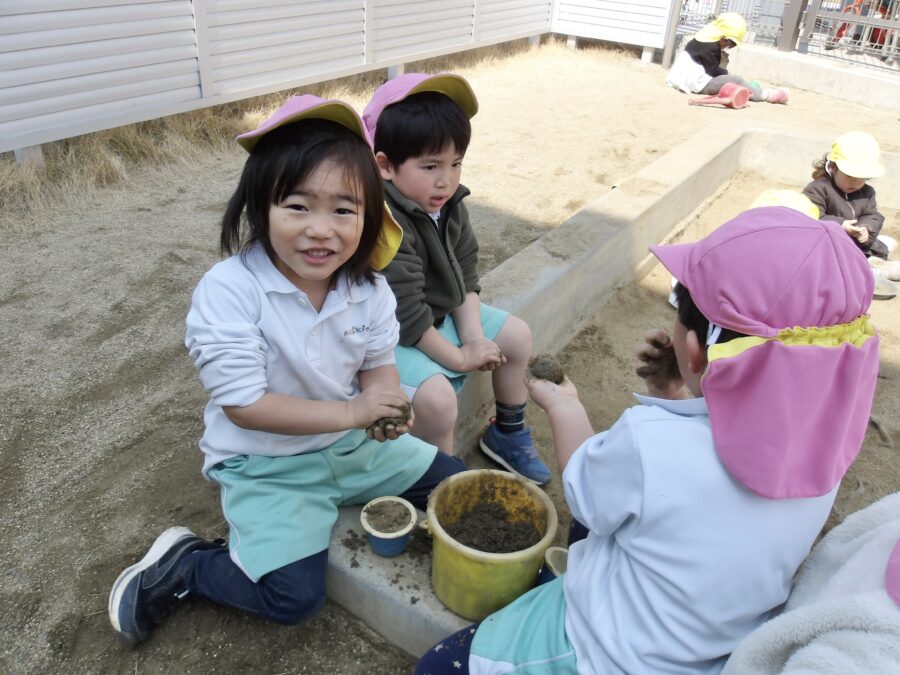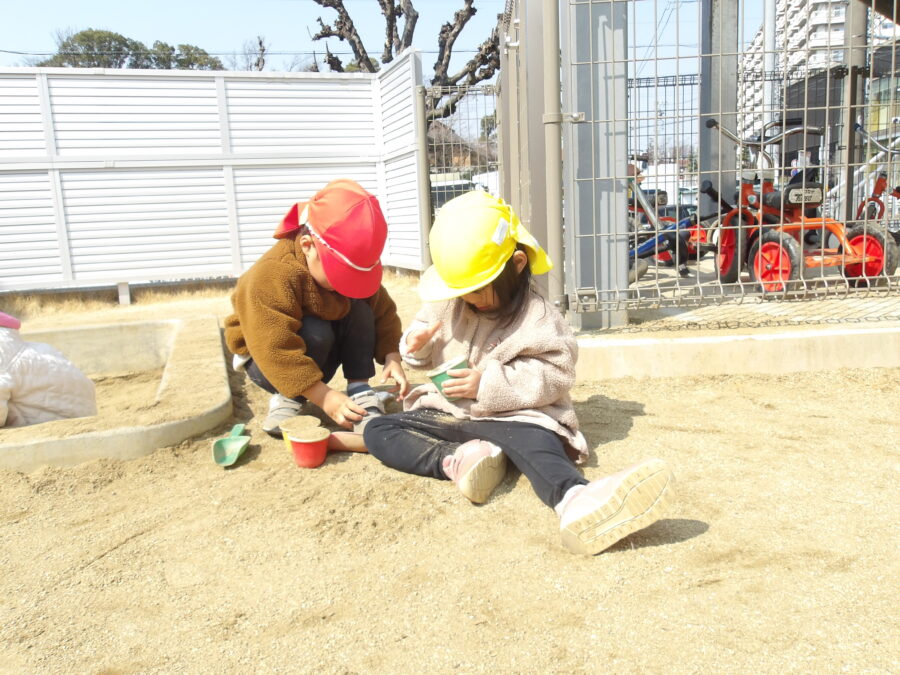 お砂場ではサラ砂を作ったり、ケーキを作ったり、保育士に食べさせてくれたり、それぞれ楽しんでいましたよ![]()