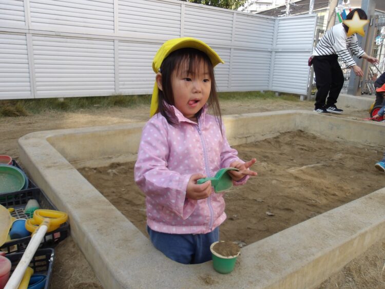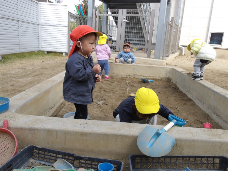 砂場ではお山やケーキを作り、葉っぱや木の棒で飾り付けて楽しむ姿もありました🍂