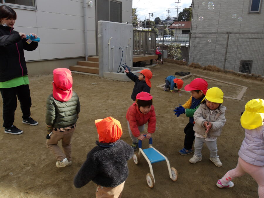 シャボン玉🫧をすると、みんな集まってきてパチンと手で捕まえたり、フーと吹いてみたり楽しんでいましたよ![]()