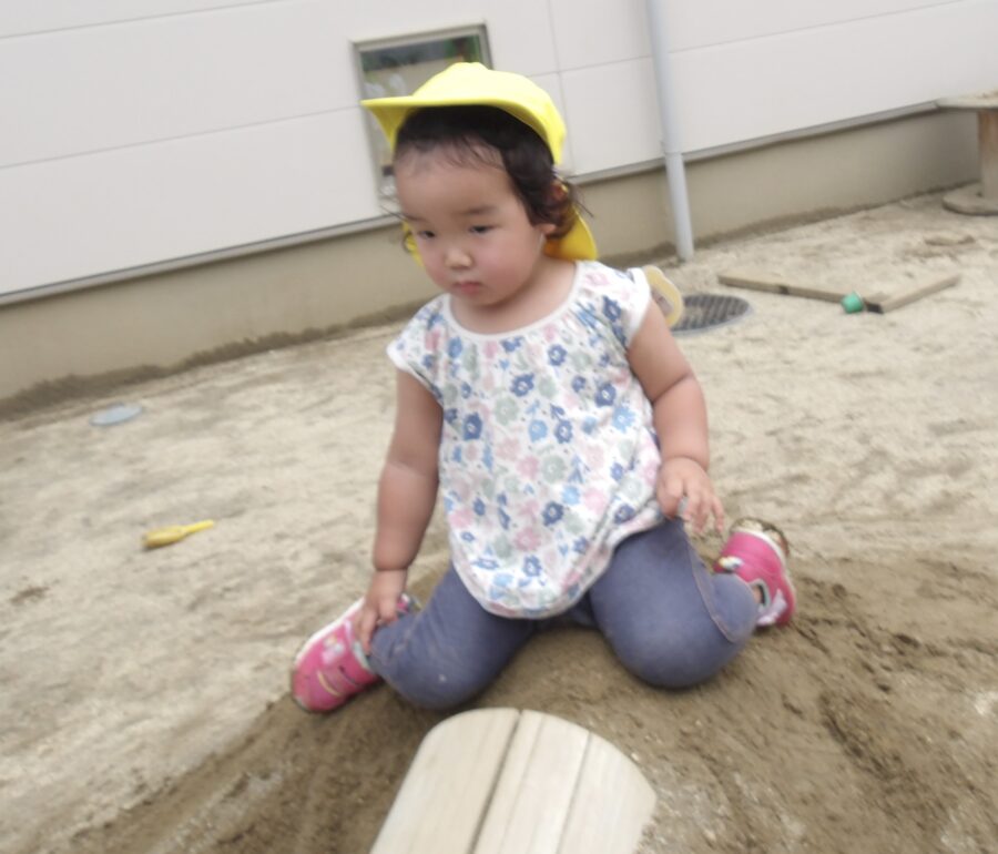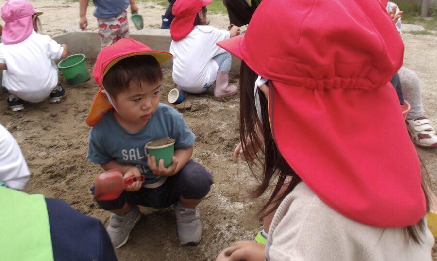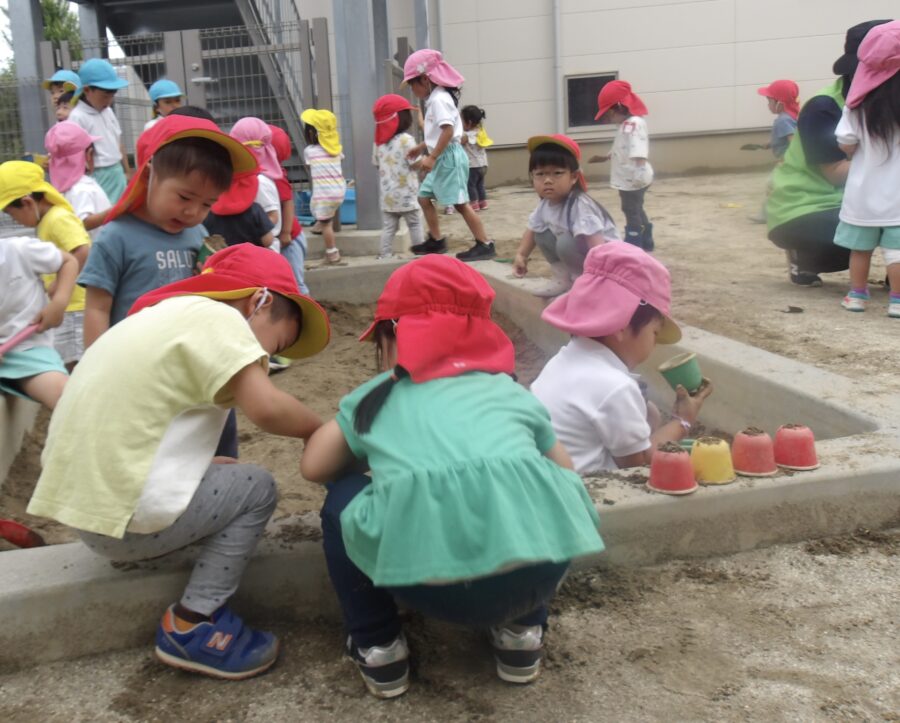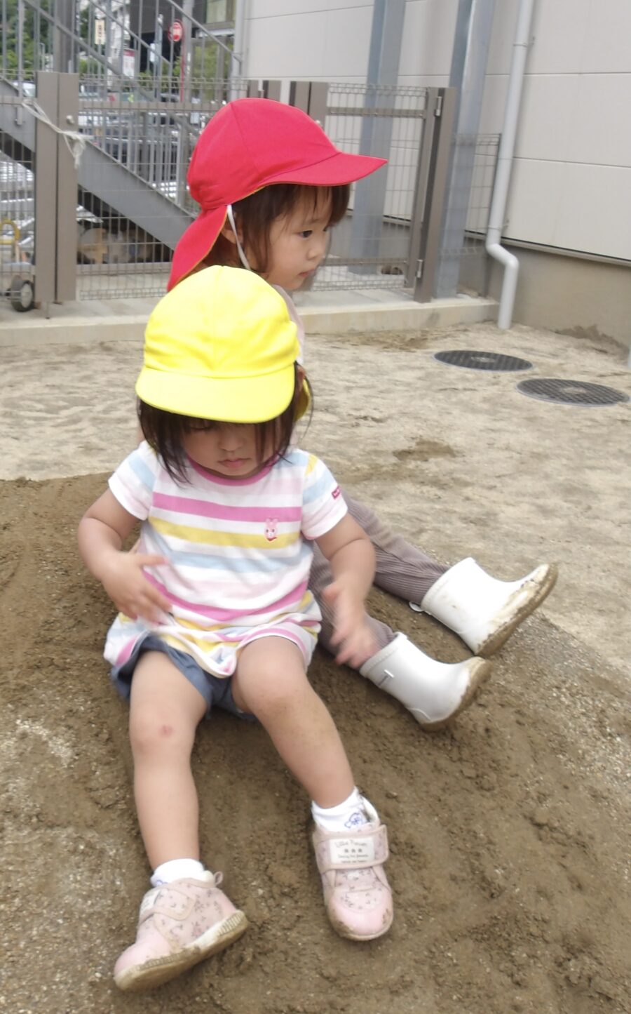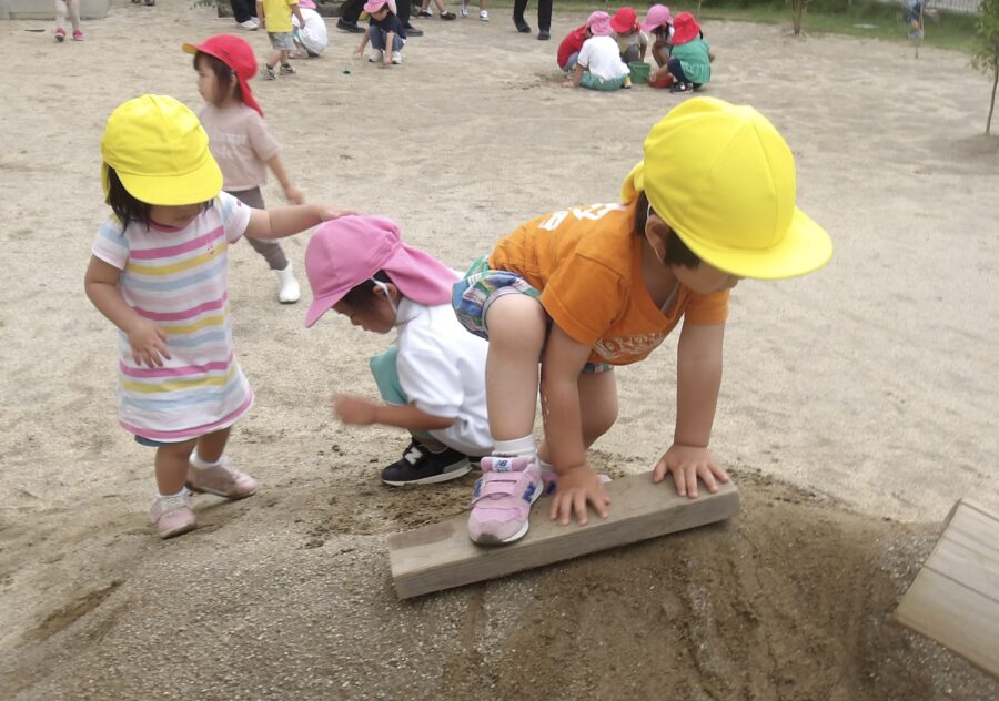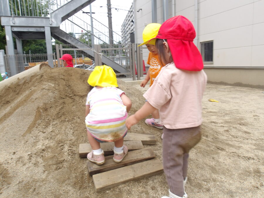 あひる組、うさぎ組のみんなは、園庭に出て遊びました。