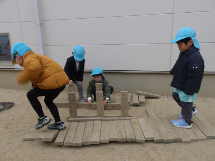 小雨が降ってきたので、雨宿りできる建物をお友だちと作っている子もいました![]()