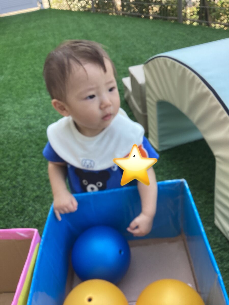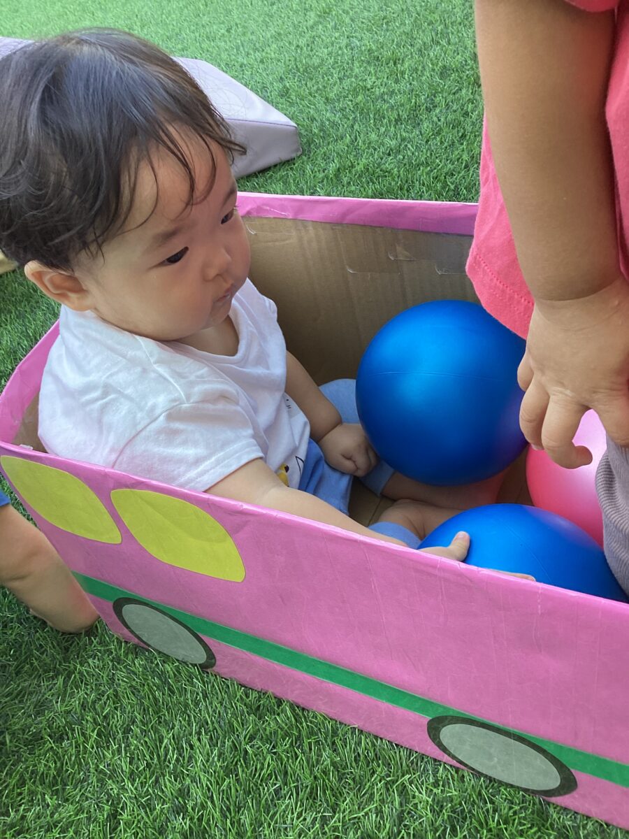 運動会の時に使ったバスを出すと、ボールをたくさん入れたりして遊びました![]()