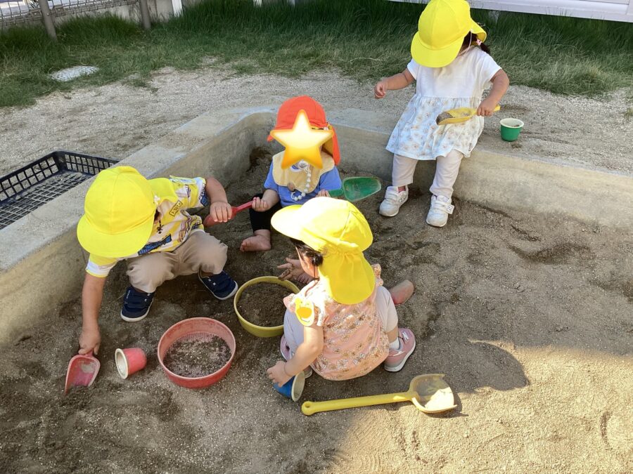 砂場ではみんなで大きな山を作ったり、ケーキやプリンなどのスイーツを作るお友だちもいましたよ![]()