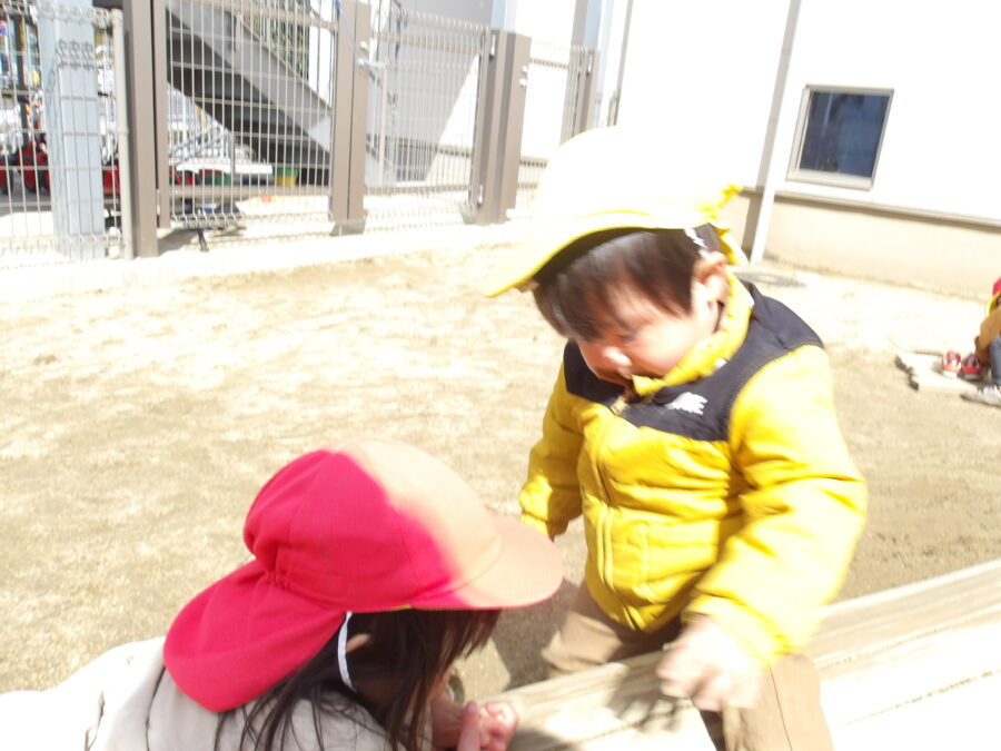 うさぎさんとあひるさんでお砂のお山でお話しをしながら、一緒に登って降りていました![]()