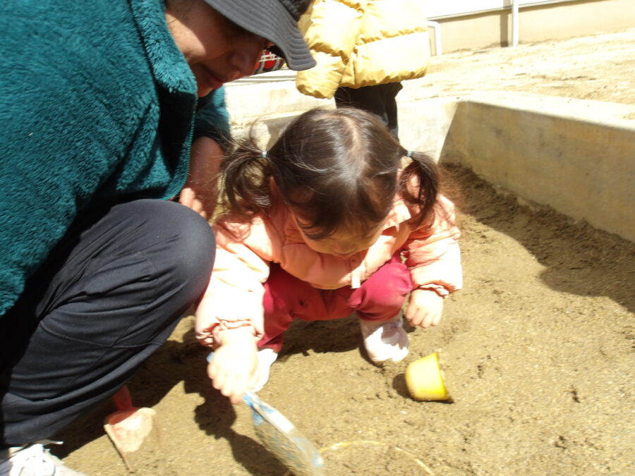 全身を使ってドロドロを楽しんだり、「お水ちょうだい!」と言ってお水をじょうろに入れてもらい、お友達とのごっこ遊びに使ったり、地面の土やお砂場の土と混ぜ合わせて何やら作って楽しんでいる様子も見られましたよ![]()