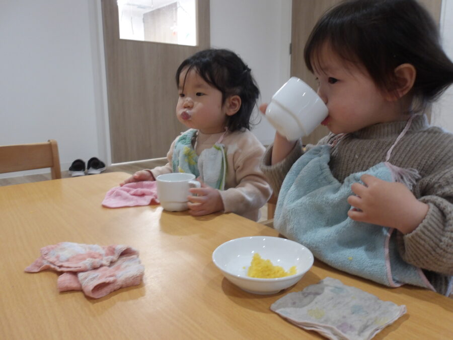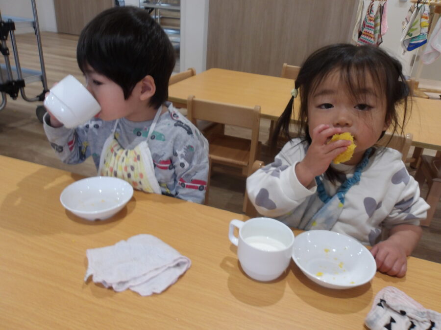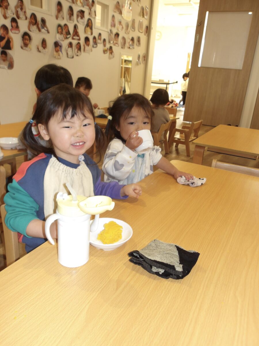 おやつを待っている際には、手を膝に置いて待っているお友達もいました!