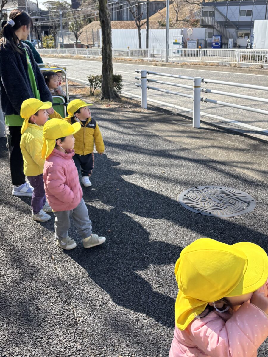 今日は、ヒューんと風が強く、歩いてもカートの中からもゆらゆらと体が動くような強さでしたが、皆高くて上下に動いているクレーン車や、地面にある葉っぱや長い木、どんぐりを見つけては、嬉しそうに触ったり、見て楽しんでいるあひるさんなのでした
