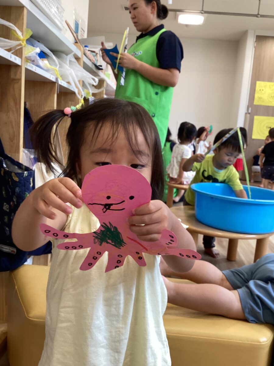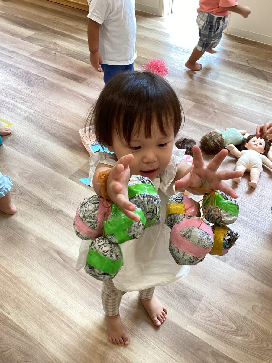以前から『わにわにのおでかけ』の絵本を読んでいたり、「お祭りにいった!」「はなびした!」というお友だちの経験から、今日は園でも夏祭りごっこをしました![]()