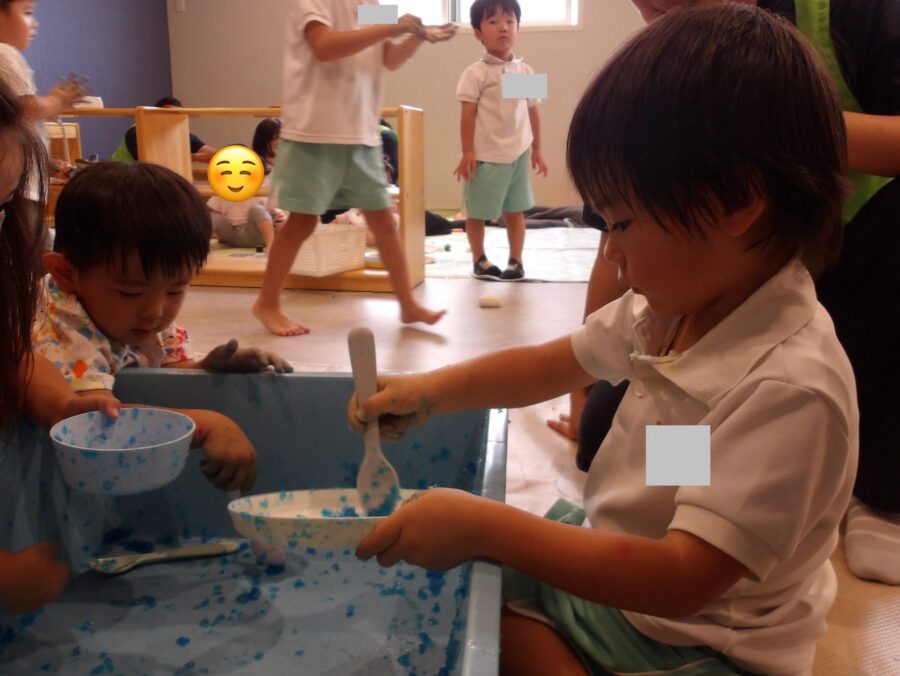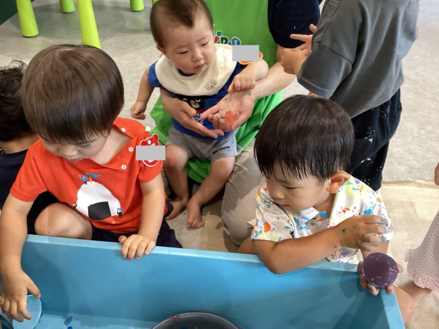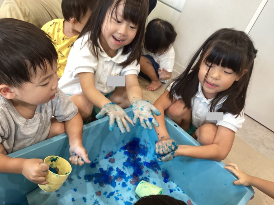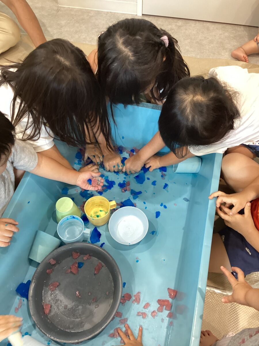 大きなたらいで寒天を細かくしたりぎゅっと手で握って異なる形にしようとしたり、遊び方は様々!!