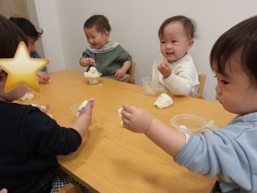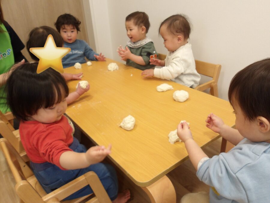 粉をこねるところから見せると、興味津々で見たり、触ったりしていましたよ![]()