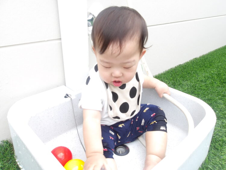 雨も上がりテラスで水遊びをしました