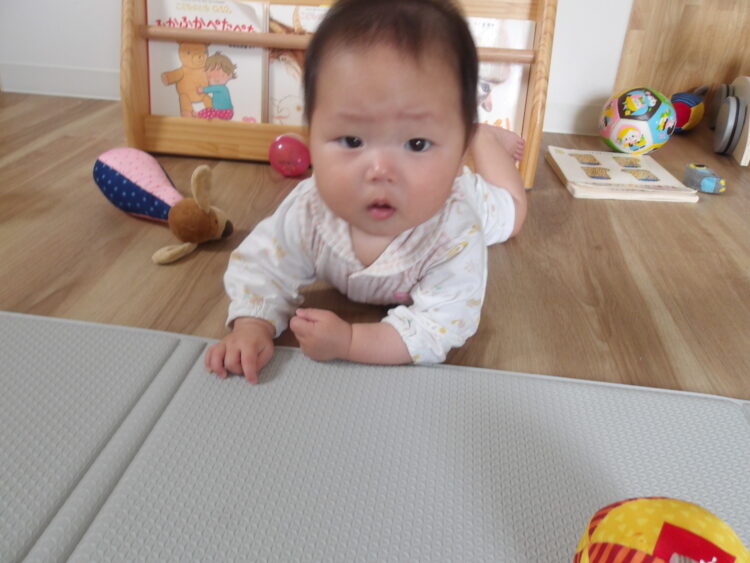 パチャパチャと音が聞こえたね お山登りもできるようになり、近くにいたお友だちを見ていました寝返りもできるようになりゴロゴロとしています