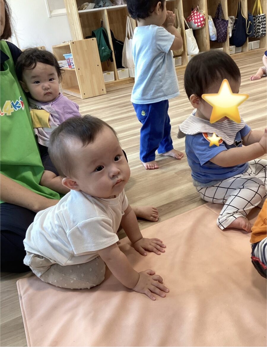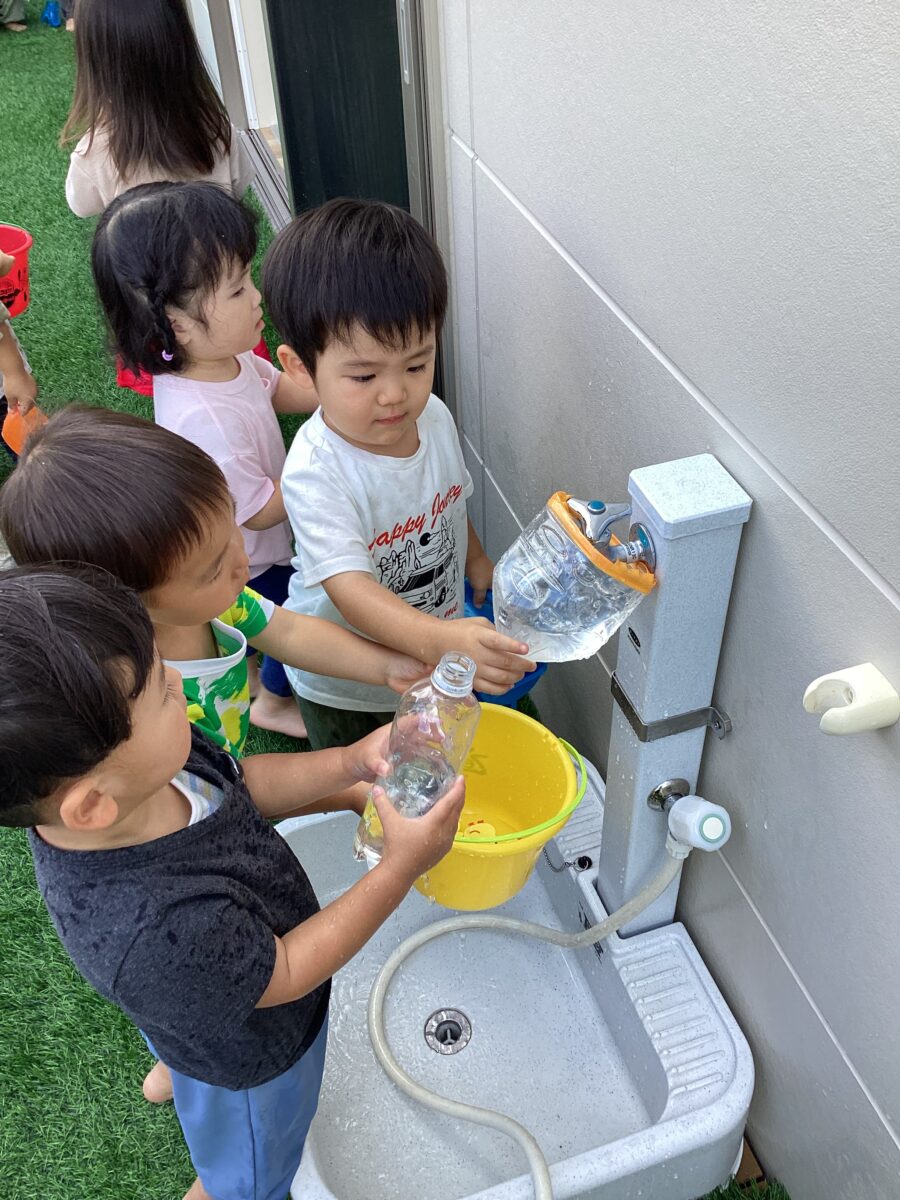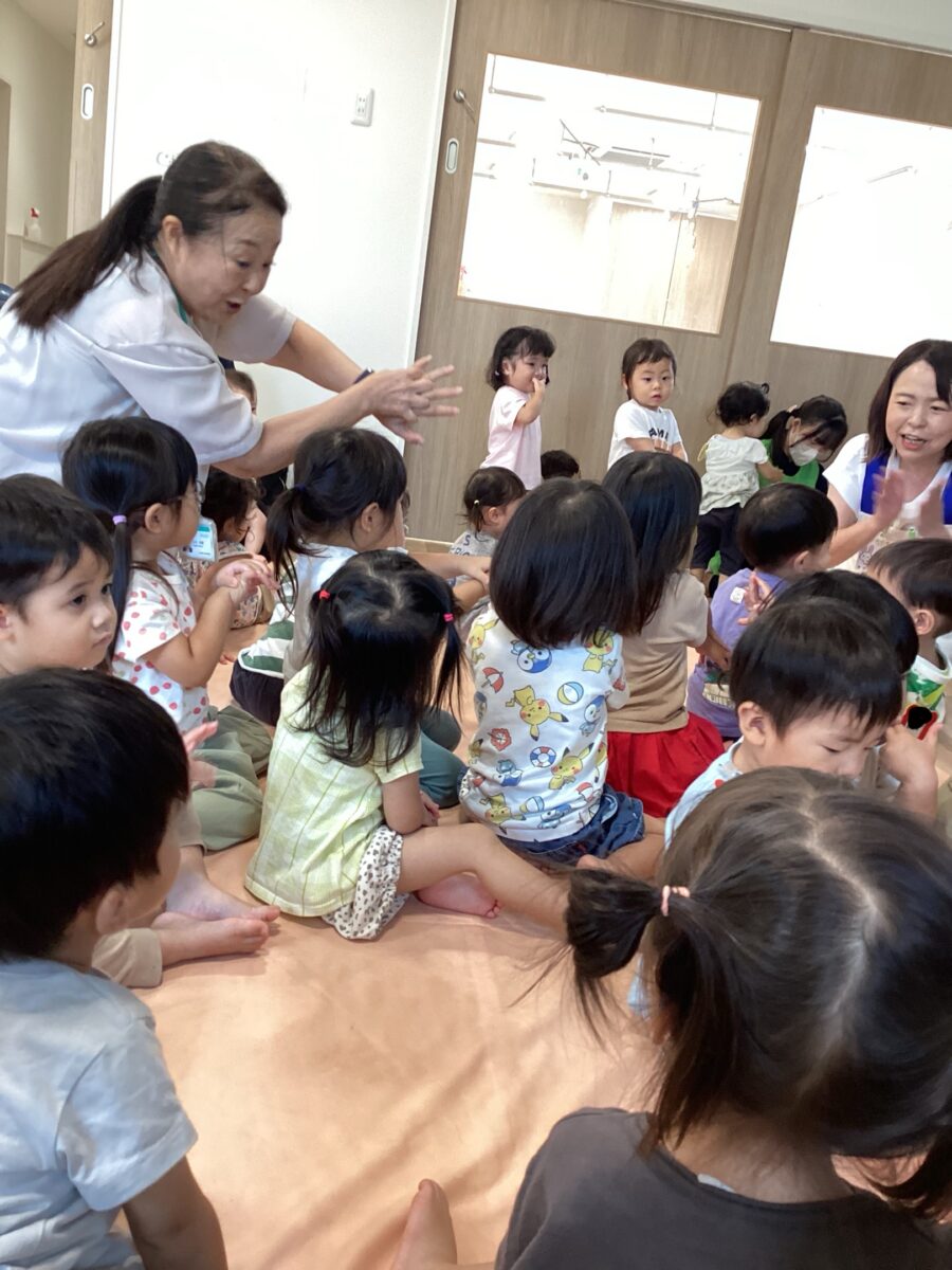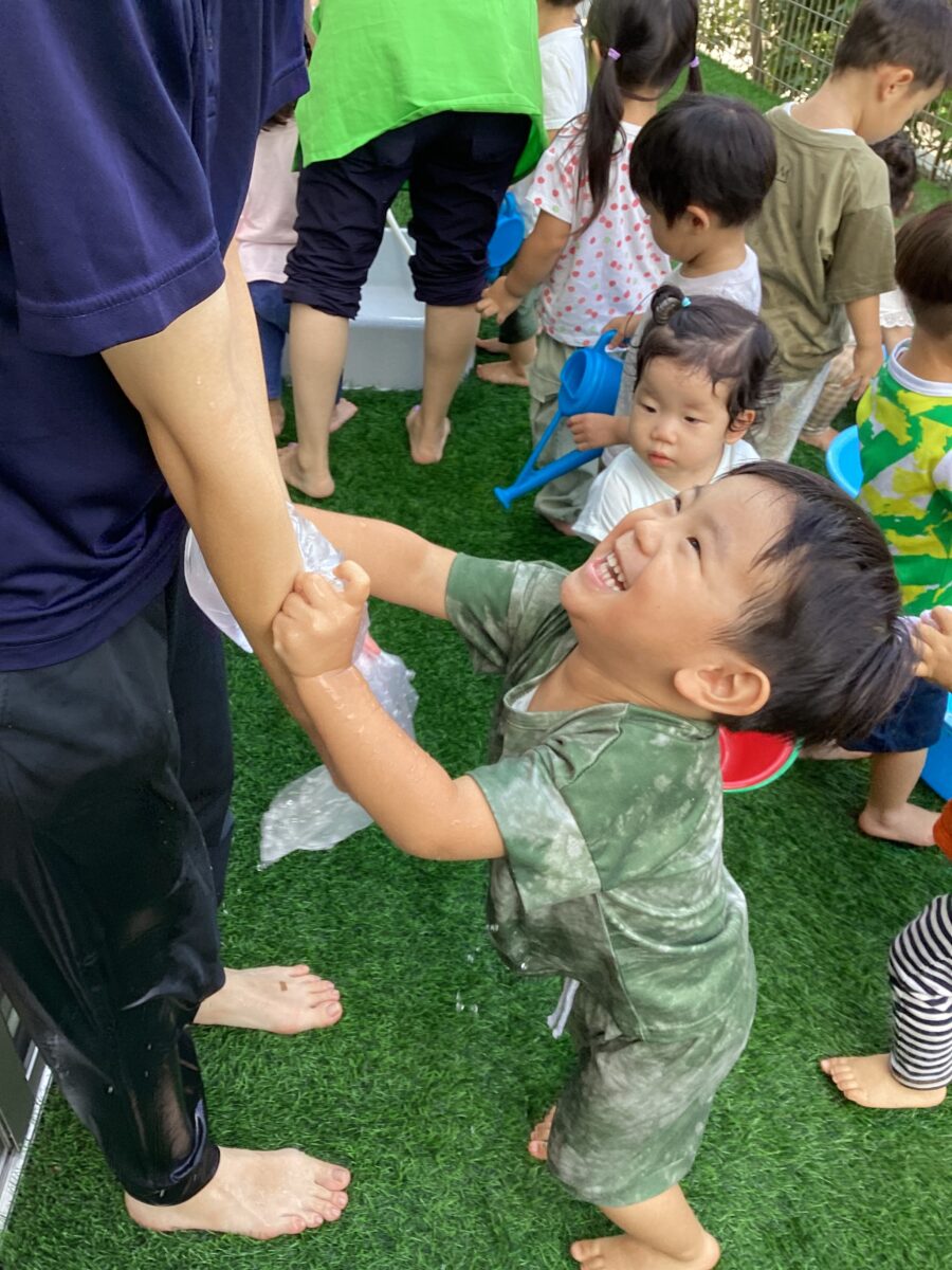今日はビニール袋や水風船にお水を入れて感触を楽しんでいました。下に落とすと、ぽちゃん!と面白い音がしたり、お顔に当ててひんやり気持ちよさそうでした。