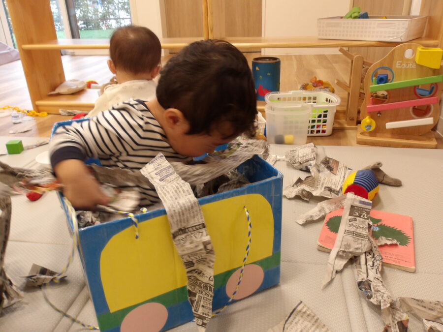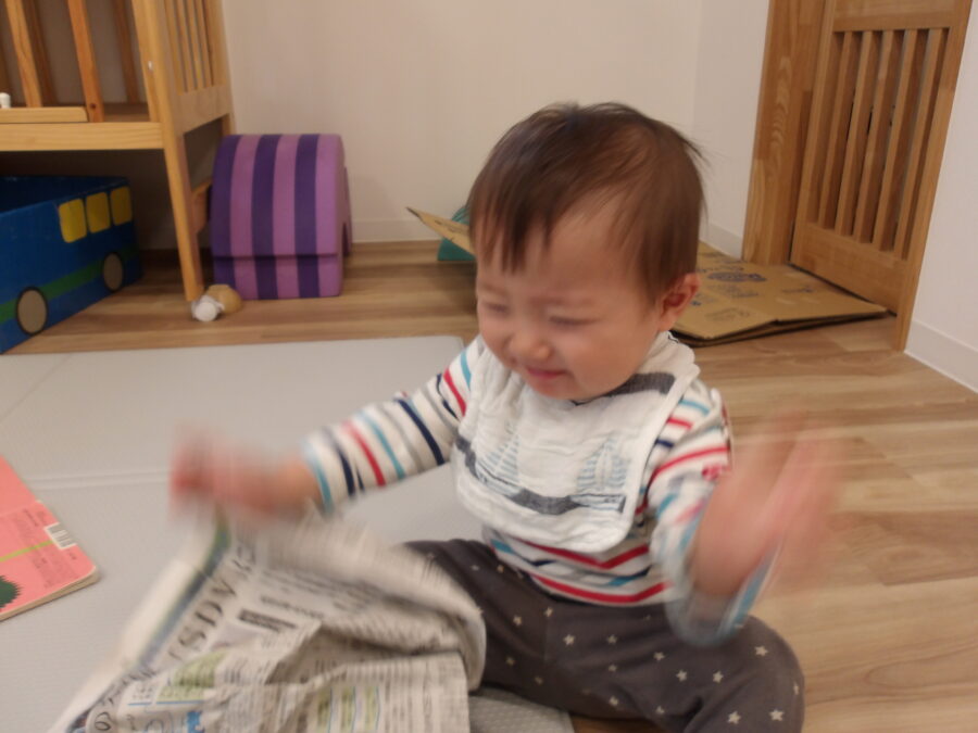 小さくなったよ!とちぎった新聞紙を見せてくれました