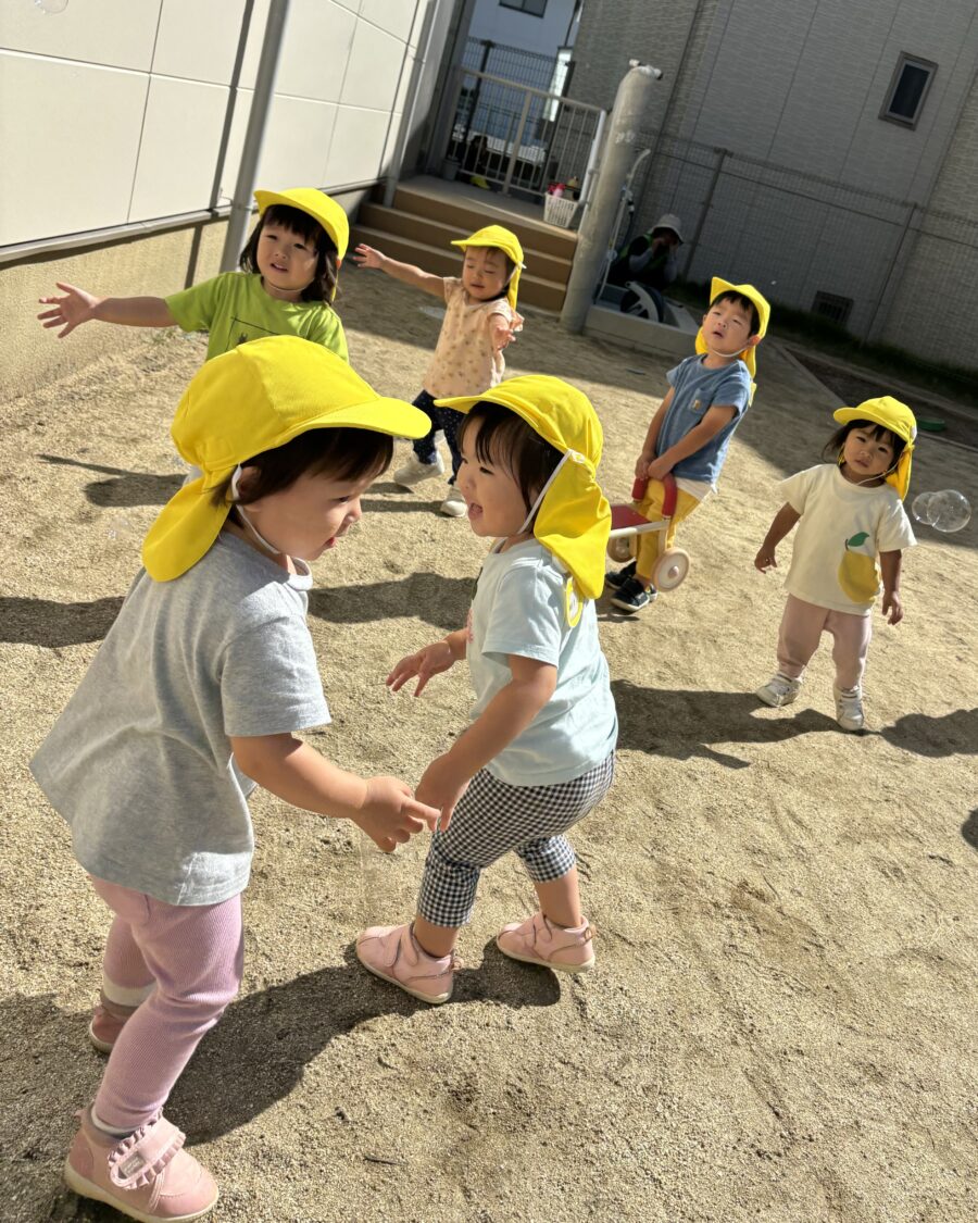 あひるぐみさんは園庭でシャボン玉やダンゴムシ探しもしました。シャボン玉がでてくる度に「きゃ〜!」と大はしゃぎでとても可愛らしかったです。
