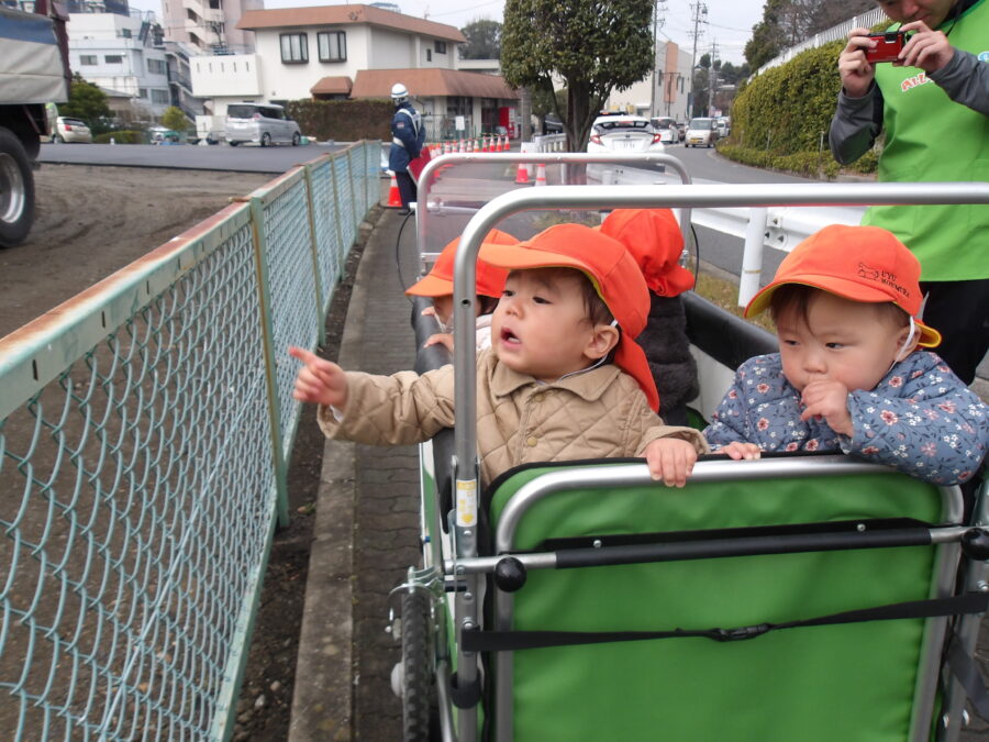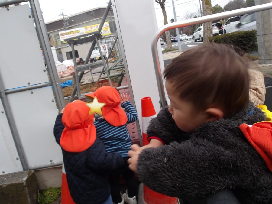 次は保育園の向かいの建設現場!興味深々に柵の合間から覗き込んでいました。大きなショベルカーが音を立てて動く度に「ガガガガー!」と声を出して真似る姿が可愛く微笑ましかったです![]()