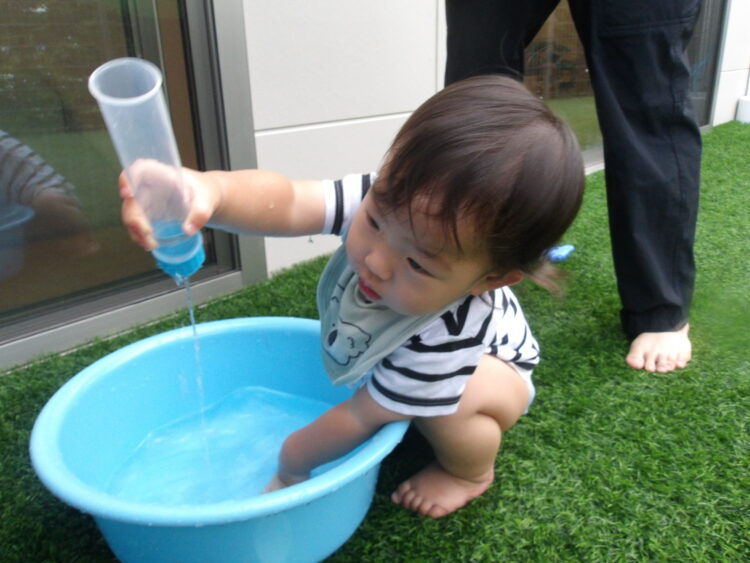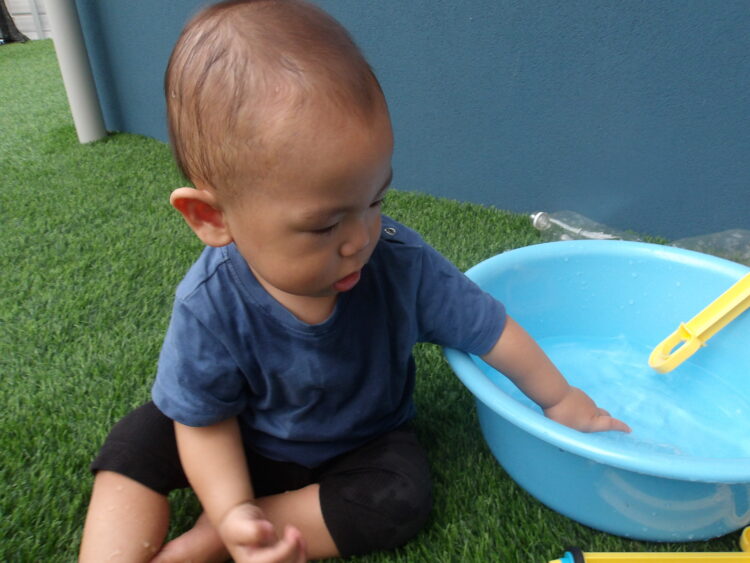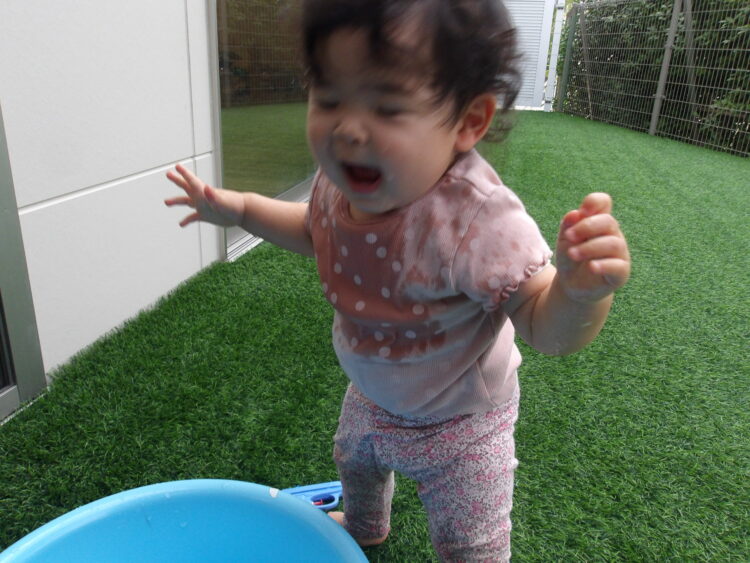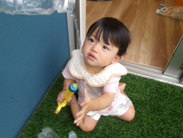 水遊び楽しんでいました 立つ事ができるようになり嬉しいですね 上から水が