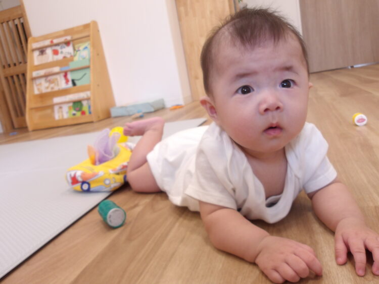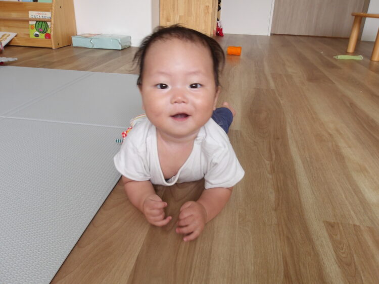 ずり這いができるようになり、好きなところに行っています お水気持ちがいいかな