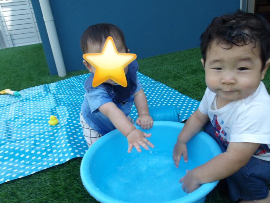タライのお水をパシャパシャお顔にお水がかかってもへっちゃらなお友達が多く、思いっきり楽しんでいる姿が見れて先生たちも嬉しいです