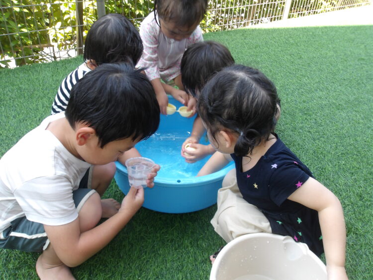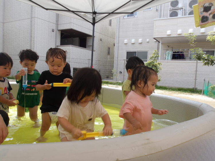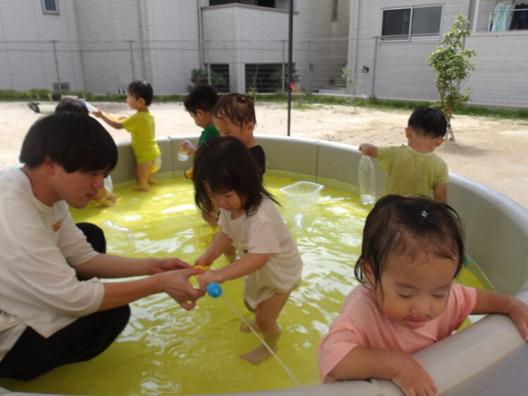 水遊び🔫 今日も元気いっぱい水遊びができました!水を怖がる子はもういません!みんな顔にかかってもへっちゃらです!最近は水風船ボールで遊ぶのがお気に入りです😊暑い日がまだまだ続きます!みんなでいっぱい楽しみますよ😊 カテゴリ: 覚王山(0〜1歳), 覚王山(2~3歳) タグ:
