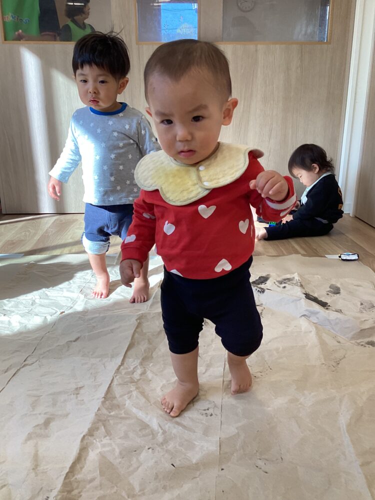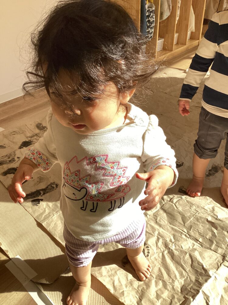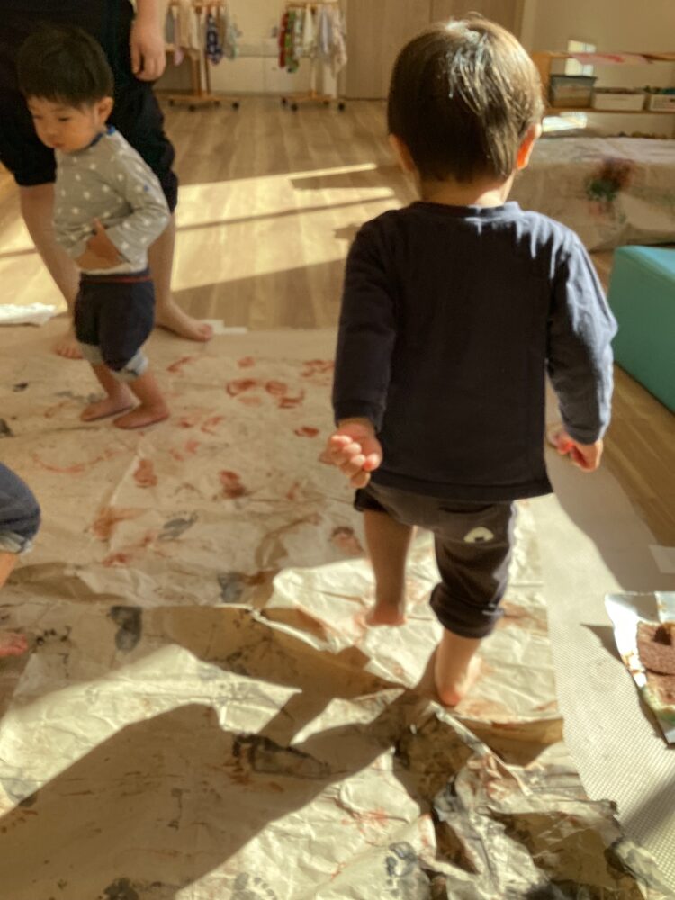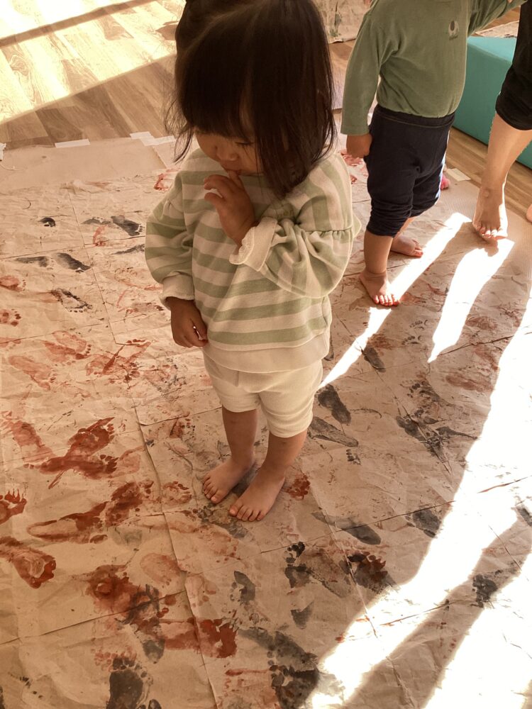足に絵の具をつけると、「なにこれ」思ったのか絵の具がついた足を見ていました![]()
