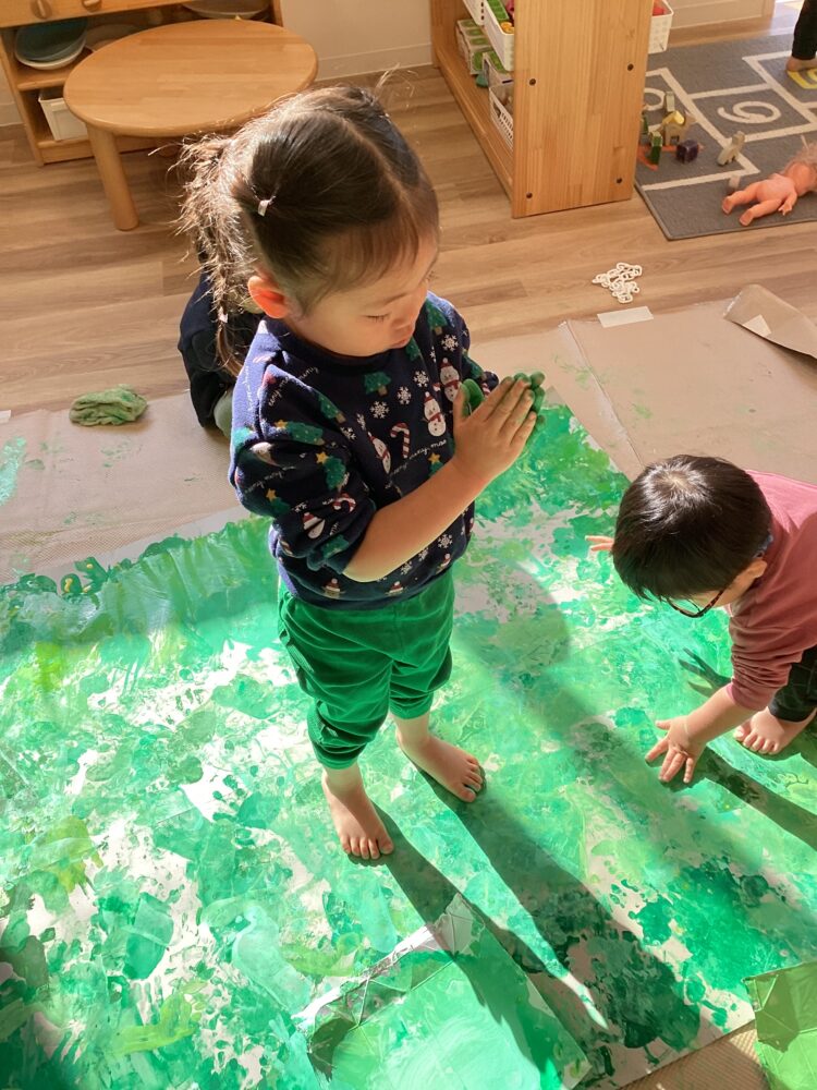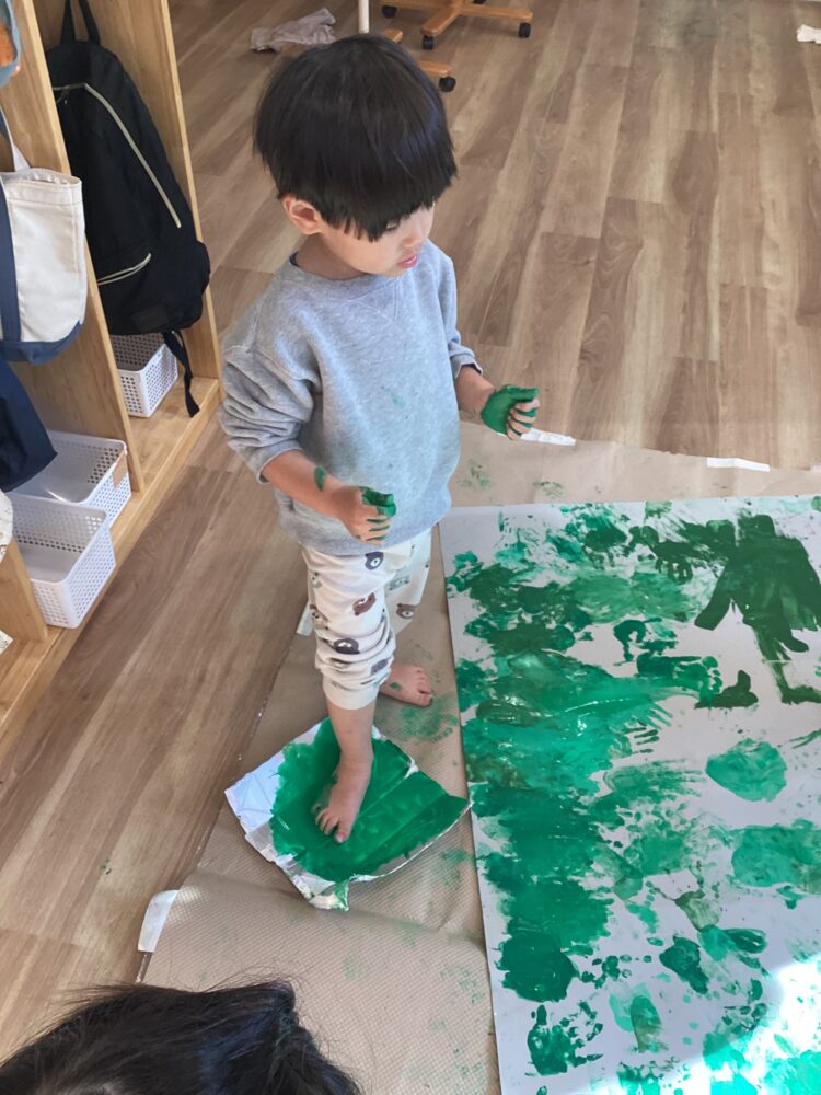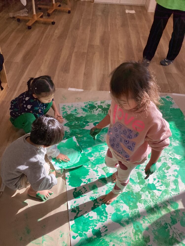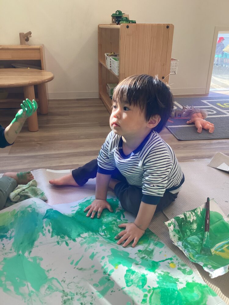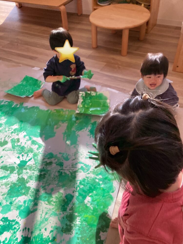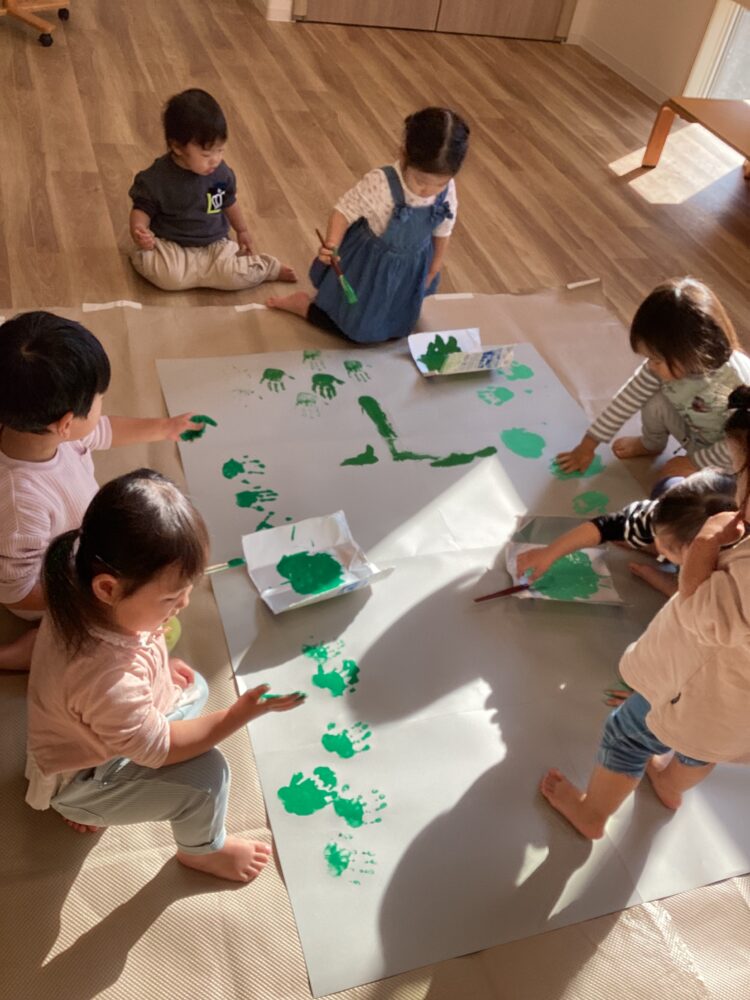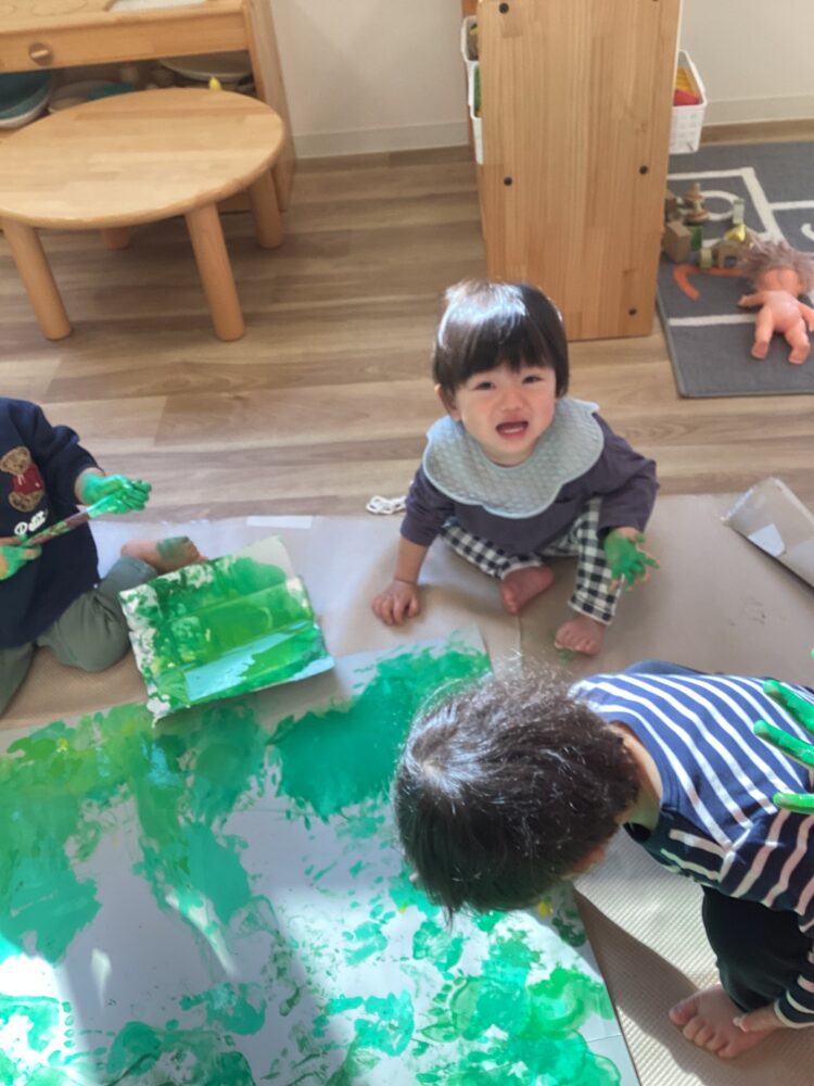 ひよこ組、あひる組、うさぎ組のみんなで絵の具遊びをしました。少し色の違う緑の絵の具を使ってスタンプ!はじめは躊躇する子もいましたが、途中からみんな楽しそうに取り組んでくれました😊