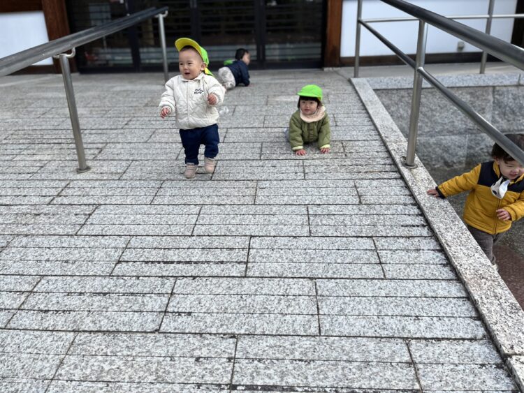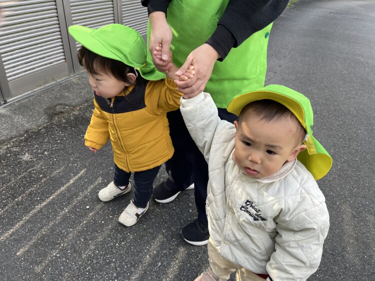 保育士と手を繋ぎ歩きました 坂道を登ったり、降りたり楽しみ、石を見つけると見つめていました明日も遊ぼうね