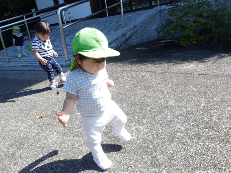 砂利の上に座って葉っぱや石を拾っていましたテラスでは音の鳴るボールで遊んでいました
