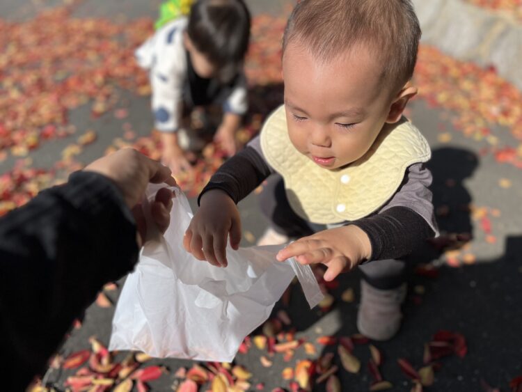 落ち葉を拾いにいったよ 舎利殿に行きました 落ち葉がたくさん落ちていました 落ち葉を拾ってくれたお友だち。 袋に入れてくれました 葉っぱの上を歩くと音が鳴って楽しんでいました 来週もたくさん遊ぼうね カテゴリ: 覚王山(0〜1歳) タグ: