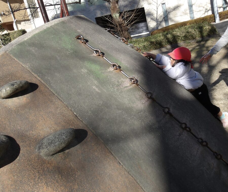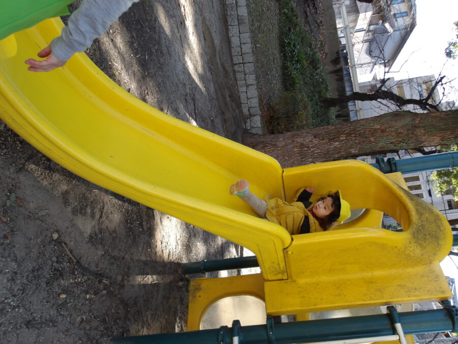 」と言って石の階段に登って斜面の滑り台を滑っていました![]()