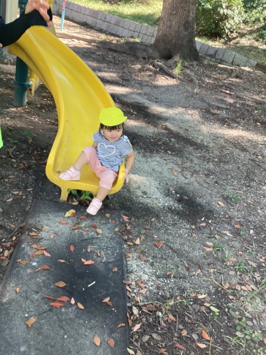 また、落ち葉の黄色の葉や赤茶色の葉を見つけると手にたくさん集めて嬉しそうにする子もいました
