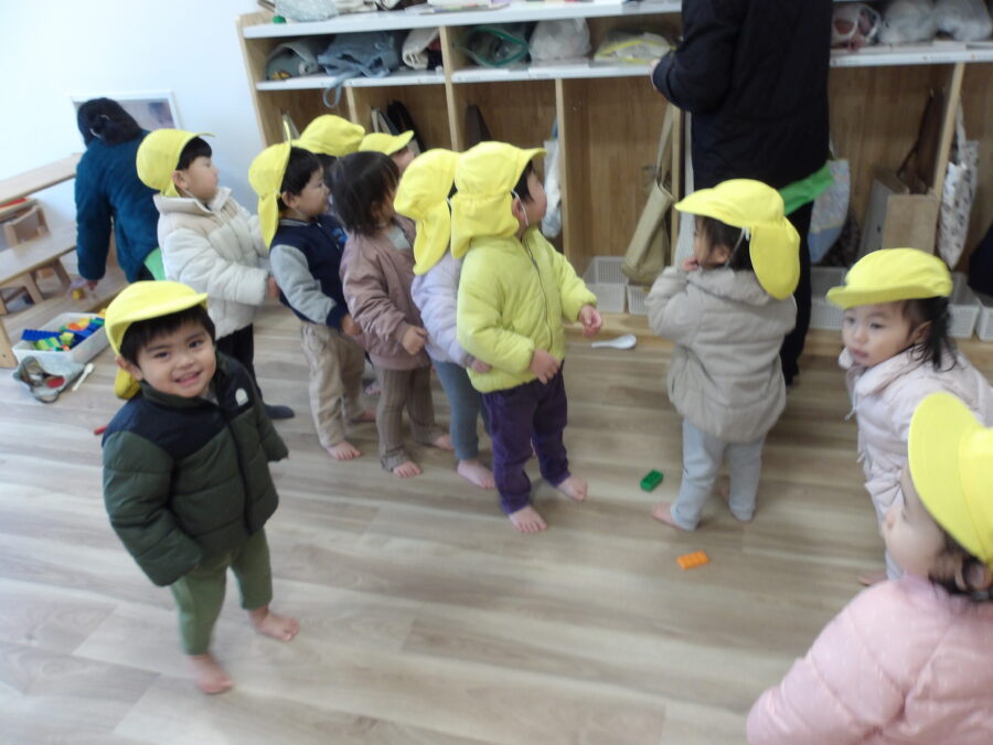 上手に手すりを使い、にじ組のお部屋に避難をすることができ、保育士のお話しを聞くことができましたよ〜