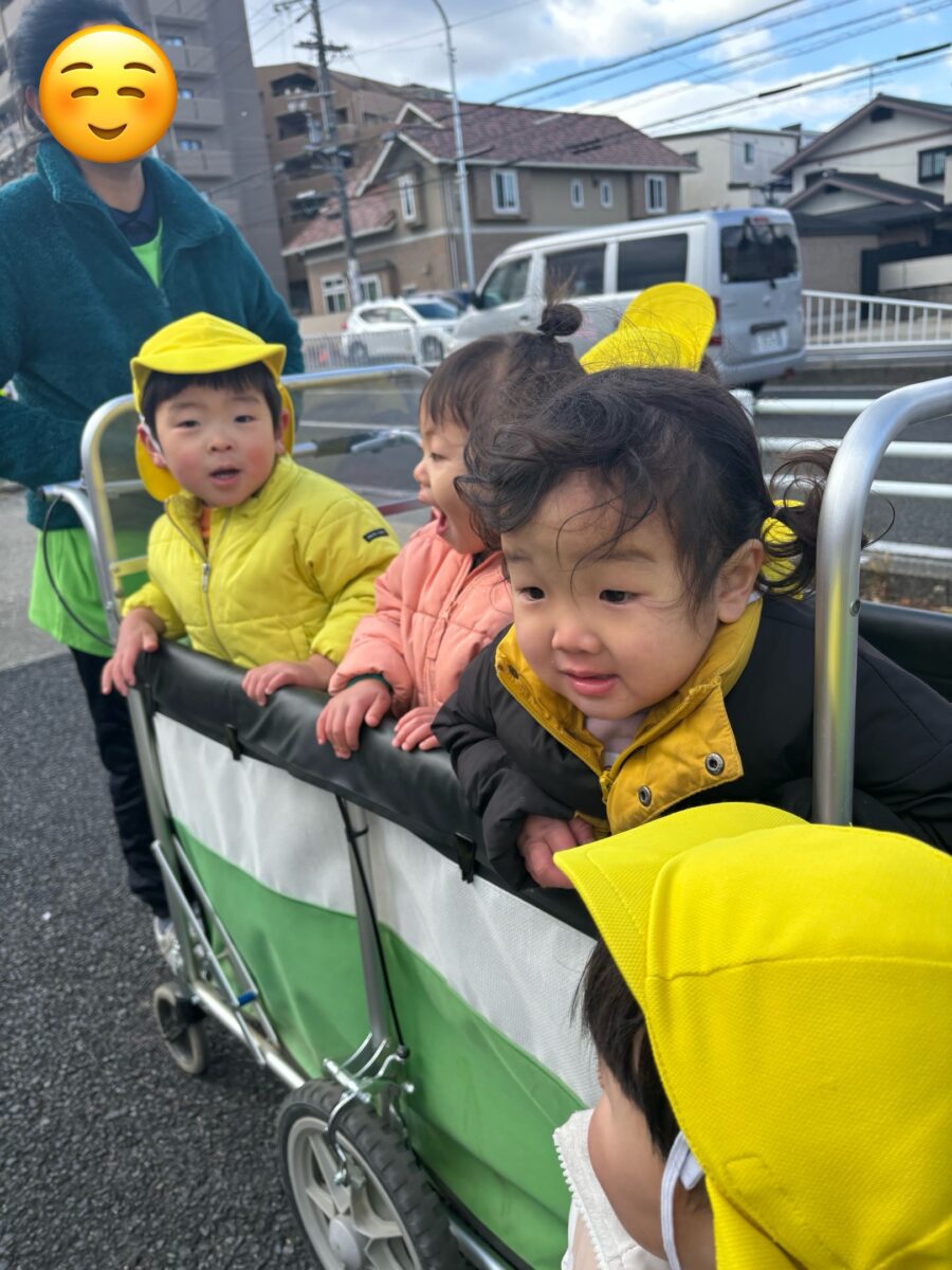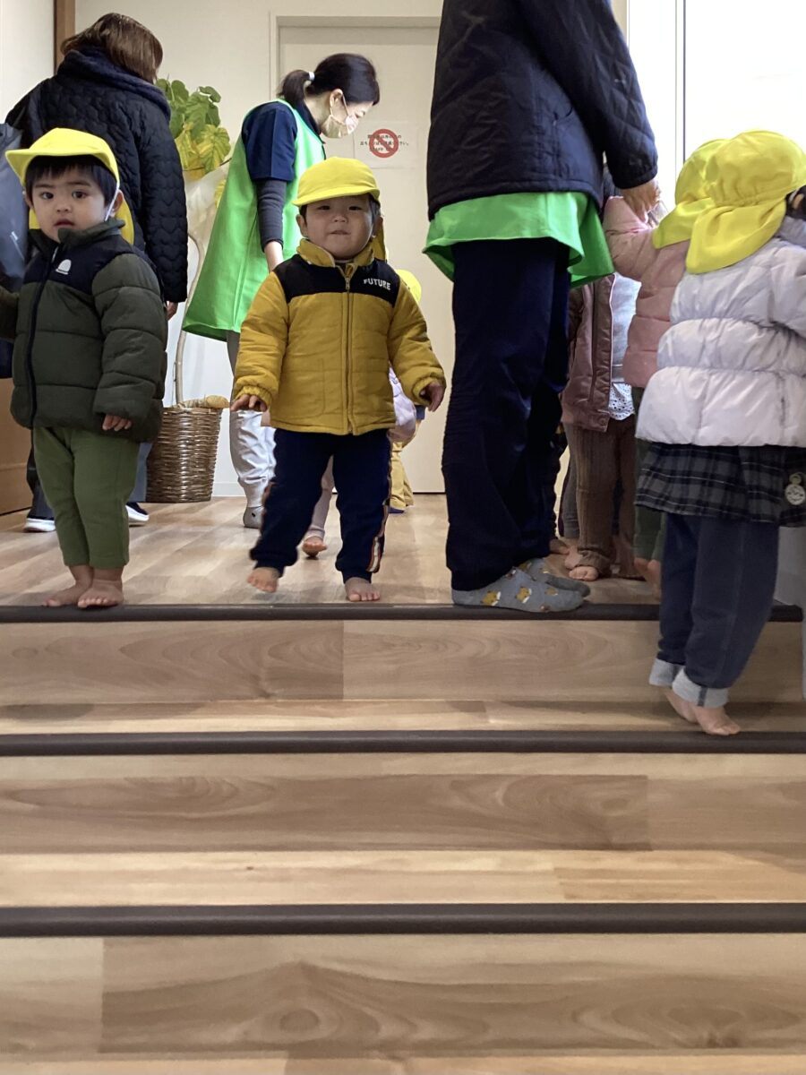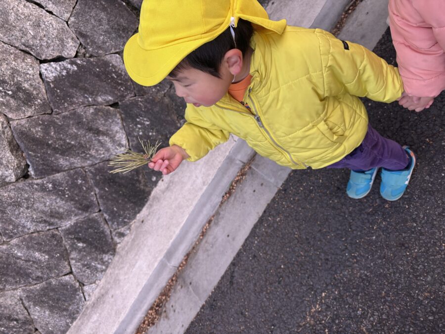 地面に落ちていたちくちくの葉っぱを見つけて、拾って「◯◯みたーい」と子どもたち同士でお話ししたりして、初めての道を楽しみましたよ!!