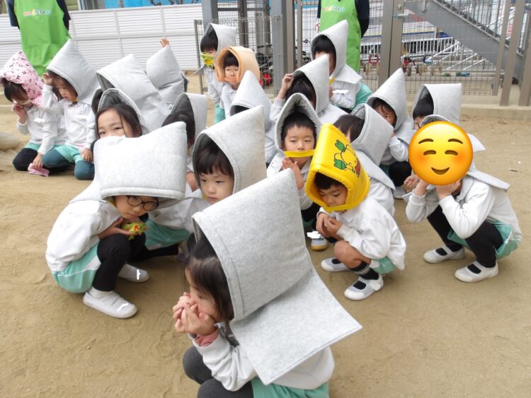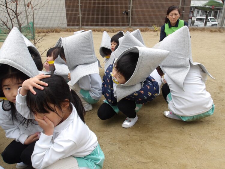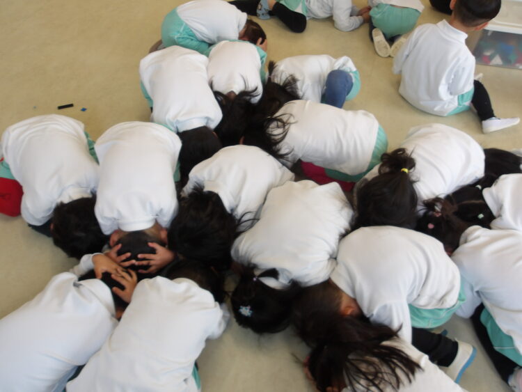 また、地震の時に頭を守れるよう、ダンゴムシのポーズも意識をして行っていました。