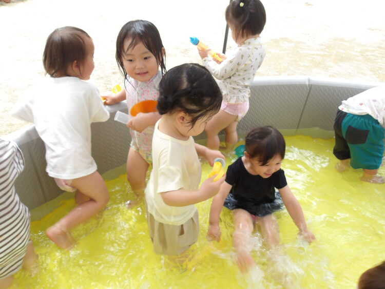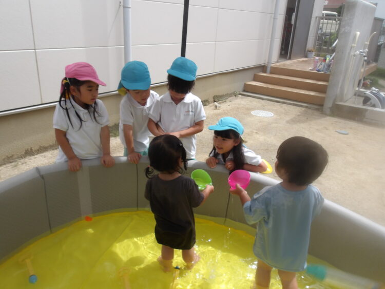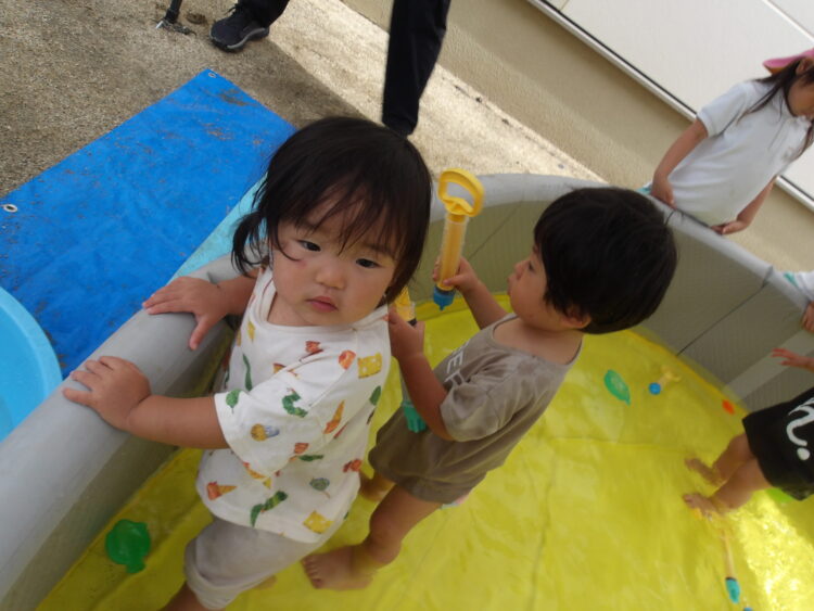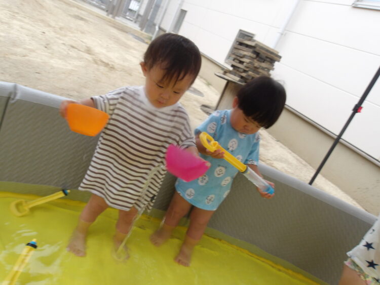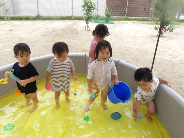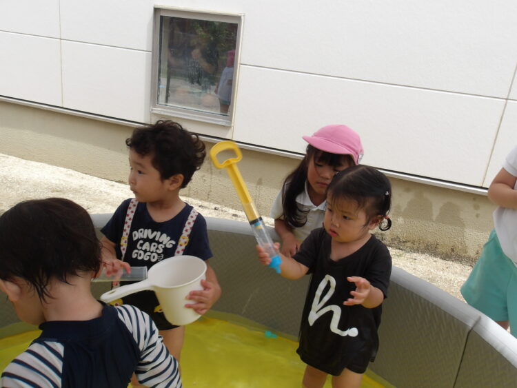 カップやバケツ、水鉄砲を使って楽しんで遊びました✨ 園庭で遊んでいたお姉さんたちも声をかけてくれ、嬉しそうにカップに入れた水を見せて“これで遊んでるんだよ〜”と紹介していました😊